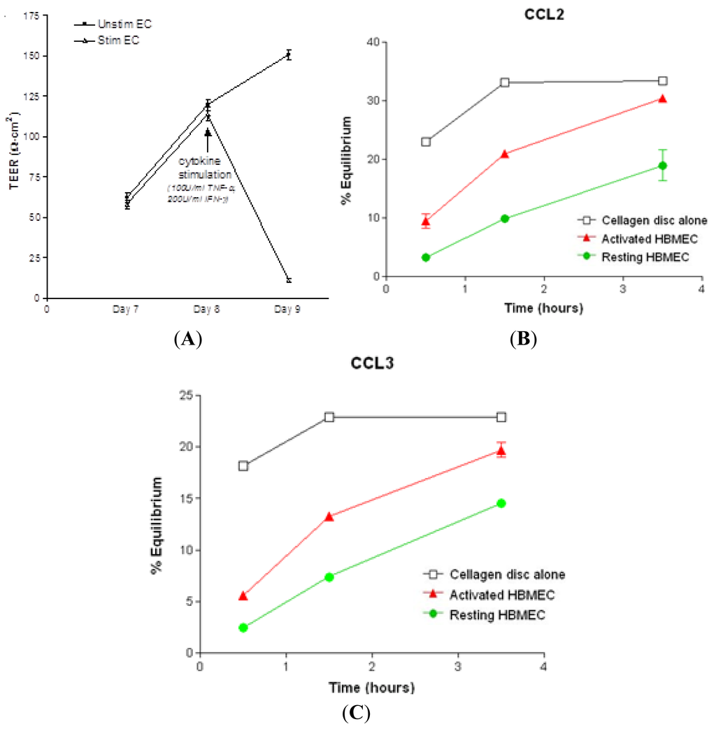 The rate of diffusion of CCL2 and CCL3 across confluent HBMEC monolayers in the presence of chemokine gradients was determined in a double-chamber chemotaxis system using radiolabeled chemokines. Confluent resting monolayers with transendothelial electrical resistance (TEER) greater than 100 Ω cm2 restricted the passage of CCL2 and CCL3 to the upper chamber, as compared to Cellagen® discs alone during the entire 3.5 h of the assay (Figure 1B,C). Treatment of confluent HBMEC monolayers with 100 U/mL TNF-α and 200 U/mL interferon-γ (IFN-γ) for 24 h decreased the TEER to less than 25 Ω cm2 (Figure 1A) and led to a rapid increase of chemokine diffusion at 1.5 and 3.5 h, compared to resting HBMEC (Figure 1B,C). In the absence of HBMEC monolayers, there was a steep increase in percent equilibrium between 0.5 and 1.5 h. The rate of equilibrium for CCL2 and CCL3 reached a plateau after 1.5 h.