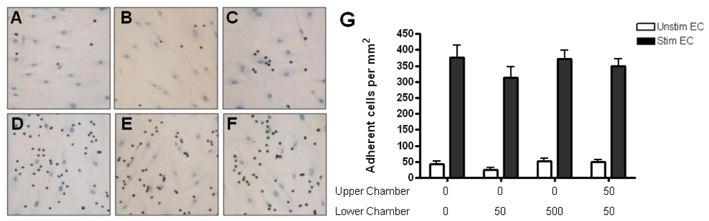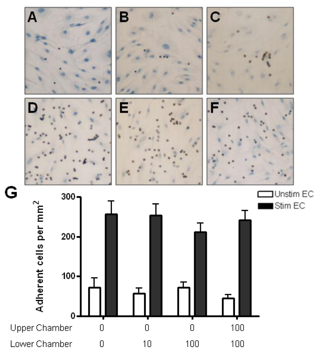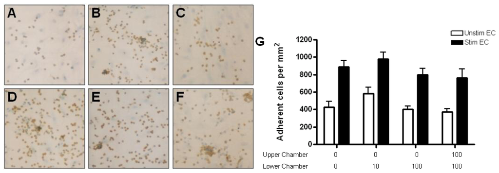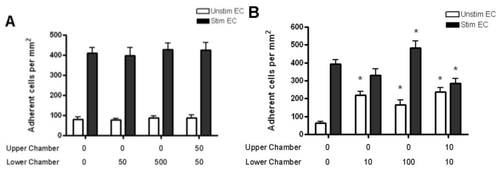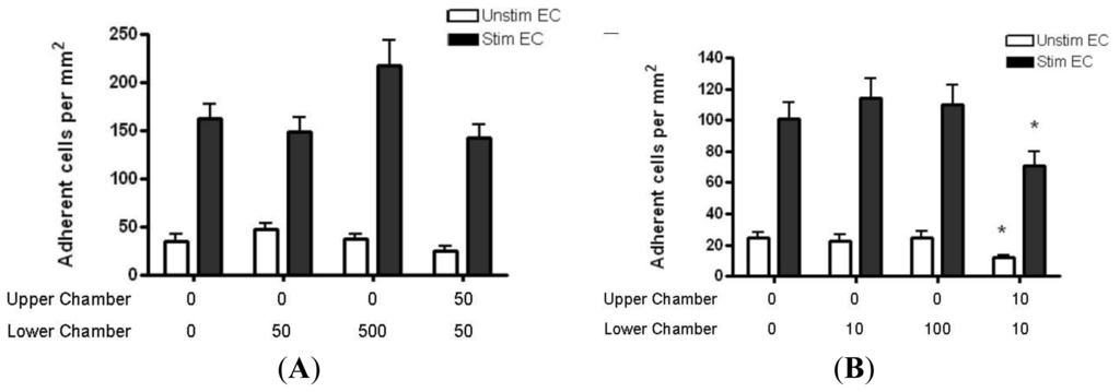 Memory T cells adhered more readily than naïve T cells to both resting and stimulated HBMEC monolayers (>50 cells/mm2). The presence of CCL2 gradients had no effect on the adhesion of memory T cells (Figure 10A), whereas CCL3 increased their adhesion to unstimulated endothelium (Figure 10B). When memory T cells were incubated with stimulated HBMEC, adhesion was upregulated in the presence of CCL3 in the lower chamber at the highest concentration (100 ng/mL). The addition of 10 ng/mL of CCL3 to both chambers resulted in decreased adhesion (Figure 10B).