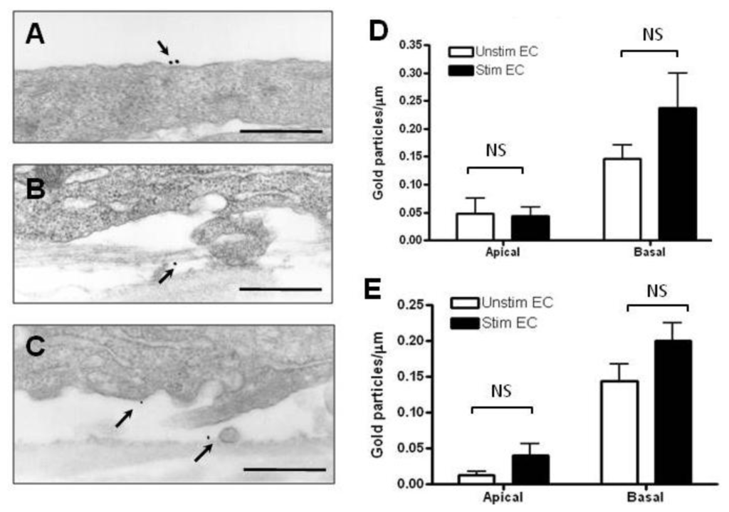 Immunoelectron microcopy was performed to localize and quantify the binding of CCL2, and CCL3 to the apical and basal endothelial surfaces and the subendothelial matrix. CCL2 bound mostly to the basal cell surface and the subendothelial matrix of both unstimulated and cytokine stimulated HBMEC (Figure 2B). Very few gold particles were found on the apical surface (Figure 2A). There was a modest, but not significant increase in the number of gold particles bound to the basal surface after cytokine stimulation of HBMEC (Figure 2C), whereas the apical density remained unchanged. Similarly, the binding of CCL3 was mostly basal under both stimulated and unstimulated conditions (Figure 3A). However, there was a trend towards increase in both apical and basal binding following cytokine stimulation (Figure 3B), but this did not reach statistical significance. Thus, the binding of CCL2 and CCL3 to the endothelium and the extracellular matrix in the presence of chemokine gradients was not significantly different between the two chemokines under resting and cytokine-stimulated conditions.