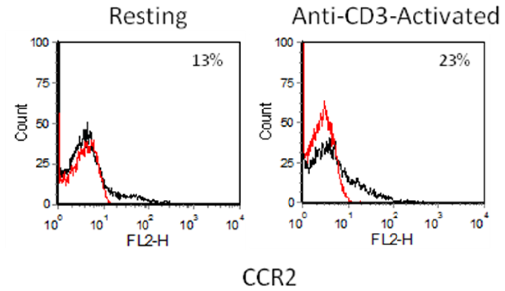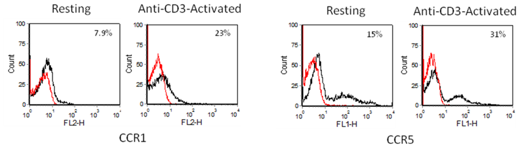 Up to 15% of resting CD4+ cells expressed the receptors CCR1, CCR2 and CCR5. Anti-CD3 activation of CD4+ T cells for 24 h increased the surface expression of all three receptors. Both resting and activated CD4+ T cells stained brightly for CCR5 as compared to CCR1 and CCR2 (Figure 3).