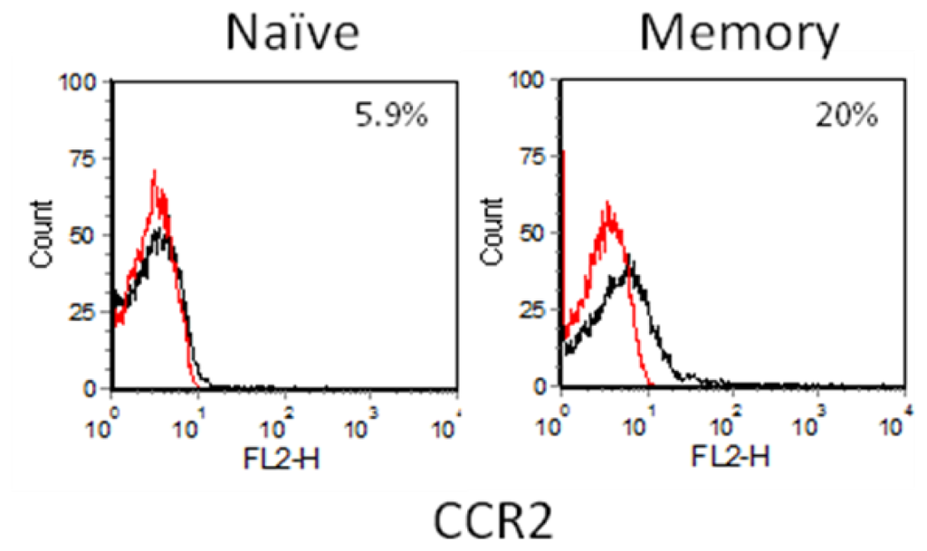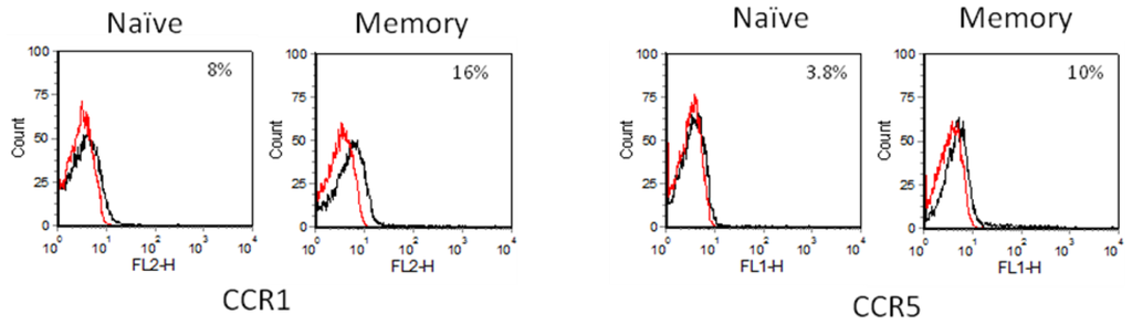 Chemokines exert their actions by signaling through their G-protein coupled, pertussis toxin-sensitive seven-transmembrane receptors on leukocytes. Each chemokine receptor can bind multiple chemokines and most chemokines bind more than one receptor. CCL2 binds the receptor CCR2, whereas CCL3 signals through two receptors, CCR1 and CCR5. The level of expression of these receptors was assessed by flow cytometry on four CD4+ T cell subsets.