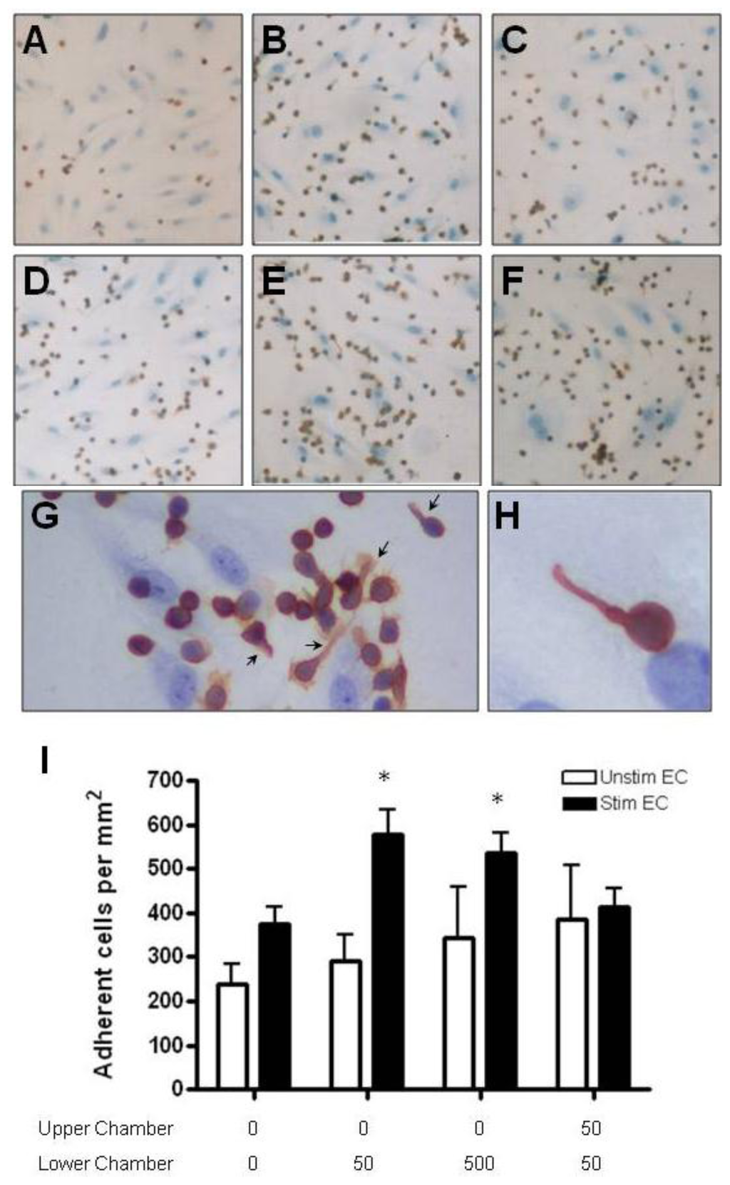 Anti-CD3-activated CD4+ T cells adhered to unstimulated HBMEC more readily than resting CD4+ T cells (>200 cells/mm2) (Figures 7 and 8). Adhesion was further augmented by two fold when HBMEC were treated with cytokines. In the presence of 50 or 500 ng/mL CCL2 in the lower chamber, a significantly greater number of activated CD4+ T cells adhered to cytokine treated but not resting HBMEC (Figure 7). The addition of CCL2 to both upper and lower chambers (no gradients) had no effect on adhesion. In contrast, CCL3 gradients had no effect on activated CD4+ T cell adhesion to either resting or cytokine stimulated HBMEC (Figure 8). In the presence of chemokines in the lower chamber, activated T cells adhering to endothelial cells often form small clusters and extend a uropod away from the cell body of the adherent lymphocyte (Figures 7E–H and 8E,F).