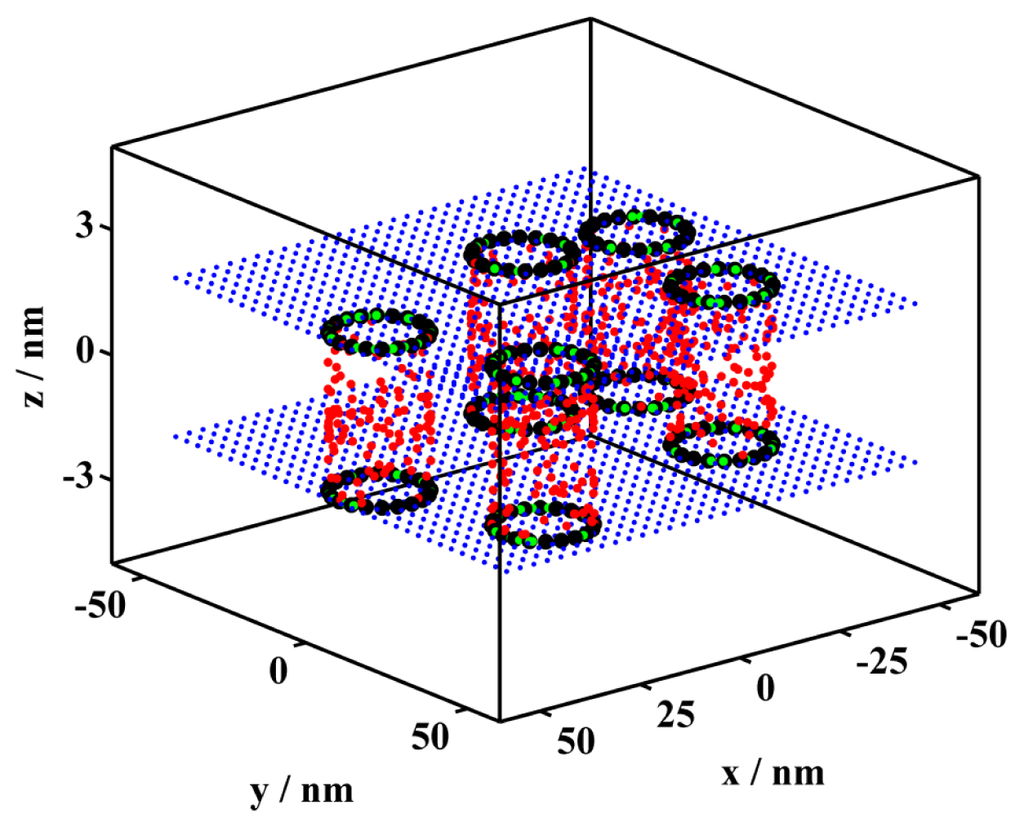 where α denotes a random number between 0 and 1. The total energy transfer rate is calculated as a sum of energy transfer rates from the excited donor i to all acceptors (first term of Equation 7). Acceptors that are beyond the cut-off distance 10R0 are included via the continuum approach (second term of Equation 7) [28]: