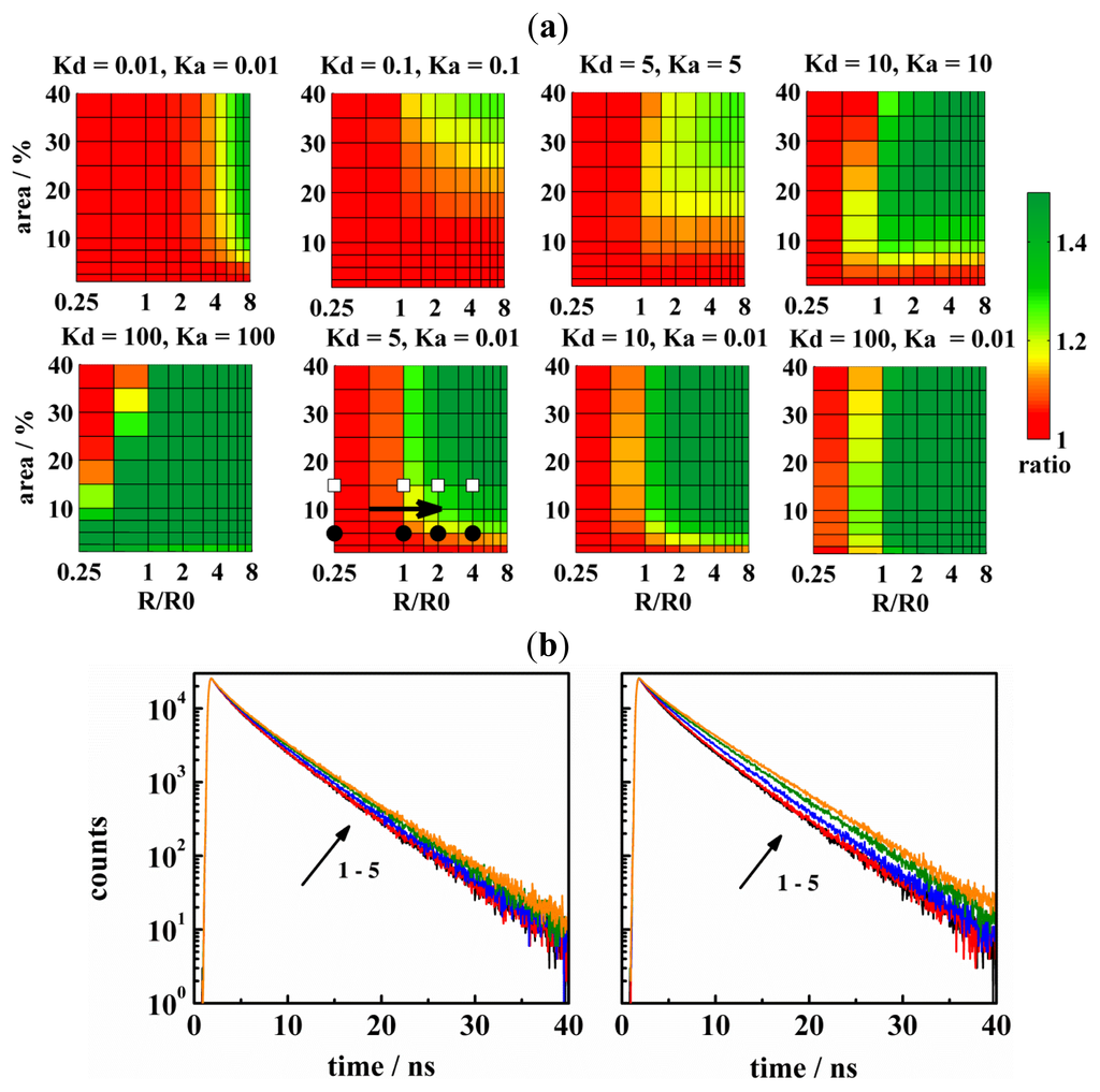 (a) The resolution of FRET in the determination of pore sizes for cases where donors have increased affinity to pores as a function of the domain area and the relative domain radius (i.e., R/R0). The FRET resolution is given by the SS-ratio. As in the two previous cases, a few points have been chosen from the diagrams and corresponding TRF-decays displayed in Figure 2b on the left (filled circles) or on the right (empty squares), respectively. Within the pores, donors were localized at the bottom/top part of the pores only (cf.Figure 1), whereas acceptors were distributed over the entire pore surface. For more details, see also Figure 2a and Figure 1; (b) TRF-decays for a few chosen cases of Figure 4a. The order of the decays is indicated by the arrow and is the following: reference case for the uniform distribution of D:s and A:s in the homogenous bilayer (black); R/R0= 0.25 (red); R/R0= 0.5 (blue); R/R0= 1 olive; and R/R0= 2 (orange). The area fraction of the domains in the bilayer, Ar, was 10% (on the left, filled circles in Figure 2a) or 30% (on the right, empty squares in Figure 2a), respectively.