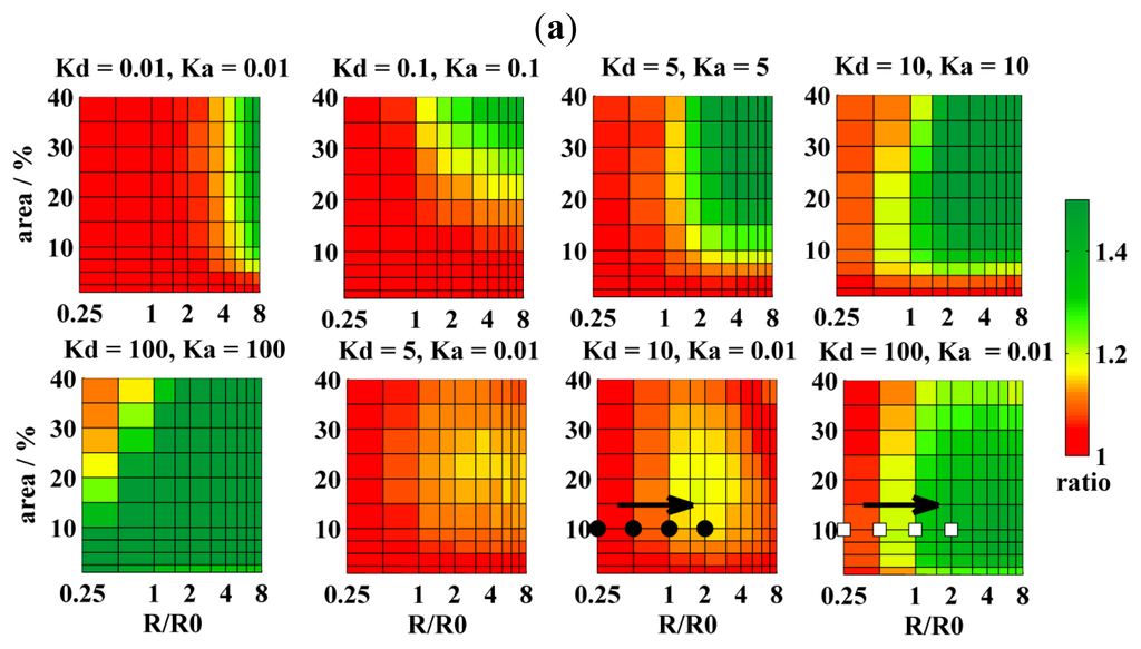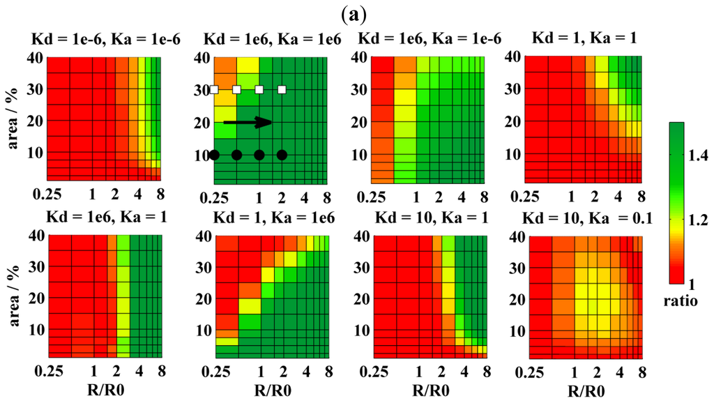 Regarding pores and their structure, two main types exist [2,15]. Toroidal pores exhibit high curvature made up by peptides and lipids. For example, these include antibacterial peptides, such as magainin-2 [16,17]. On the other hand, barrel-stave pores are exclusively formed by peptides (e.g., alamethicin [18]), and the bilayer does not bend in the pores [19]. Pores may also form proteins, such as Bax [20,21], or a bacterial toxin α-hemolysin [22], but the pore structure is less known. Situation 1 seems thus convenient for barrel-stave pores, which do not offer any free area for the lipid-based probes, as well as for toroidal pores, where it is to expect that KD,A of cylindrically shaped probes would not exceed unity due to high pore-curvature. As is shown in Figure 3a, resolution of pore-sizes comparable to R0 is as poor as in the case of domains and improves a little with increasing the pore radius and the area fraction. Naturally, resolution can be further improved by using higher acceptor concentrations (cf.Figure 3a,b with acceptor to lipid ratios 1:200 or 1:100, respectively).