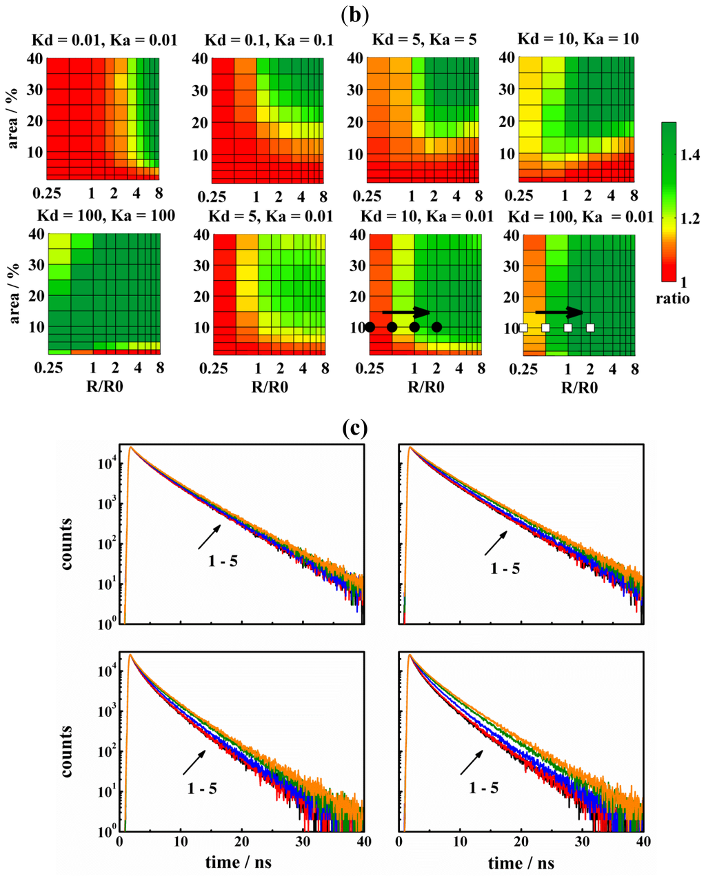 (a,b) The resolution of FRET in the determination of pore sizes as a function of the domain area and the relative domain radius (i.e., R/R0). The FRET resolution is given by the SS-ratio. To enable direct comparison with the Lo domains, KD and KA have been kept the same. As in the previous case, a few points have been chosen from the diagrams and corresponding TRF-decays displayed in Figure 3c on the left (filled circles) or on the right (empty squares), respectively. Within the pores, donors were localized at the bottom/top part of the pores only (cf.Figure 1), whereas acceptors were distributed over the entire pore surface. The acceptor to lipid ratio was 1:200 in Figure 3a, while it was 1:100 in Figure 3(b). For more details, see also Figure 2a and Figure 1; (c) TRF-decays for a few chosen cases of Figure 3a (first row) or Figure 3a (second row), respectively. The order of the decays is indicated by the arrow and is the following: reference case for the uniform distribution of D:s and A:s in the homogenous bilayer (black), R/R0 = 0.25 (red), R/R0 = 0.5 (blue), R/R0 = 1 olive and R/R0 = 2 (orange). The area fraction of the domains in the bilayer, Ar, was 10%. The left part of the figure displays four chosen decays of Figure 3a (filled circles), where KD = 10 and KA = 0.01, whereas the right part of the figure shows four chosen decays of Figure 3a, b (empty squares), where KD = 100 and KA = 0.01.