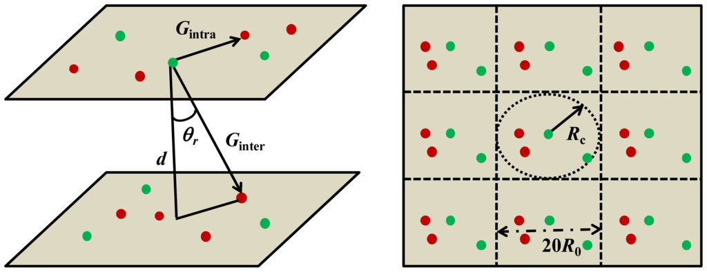 (left) Intra- and inter-energy transfer from donors (green spheres) to acceptors (red spheres) in a lipid bilayer. d denotes the bilayer thickness and θr the angle between the bilayer normal and the vector connecting D/A. (right) A schematic top view of the lipid bilayer divided into a replicated box (in the middle) and nine neighboring replicas. The size of the replicated box is 20R0. Energy transfer rate of the acceptors that are found outside the cut-off radius Rc = 10R0 is calculated via the continuous approach.