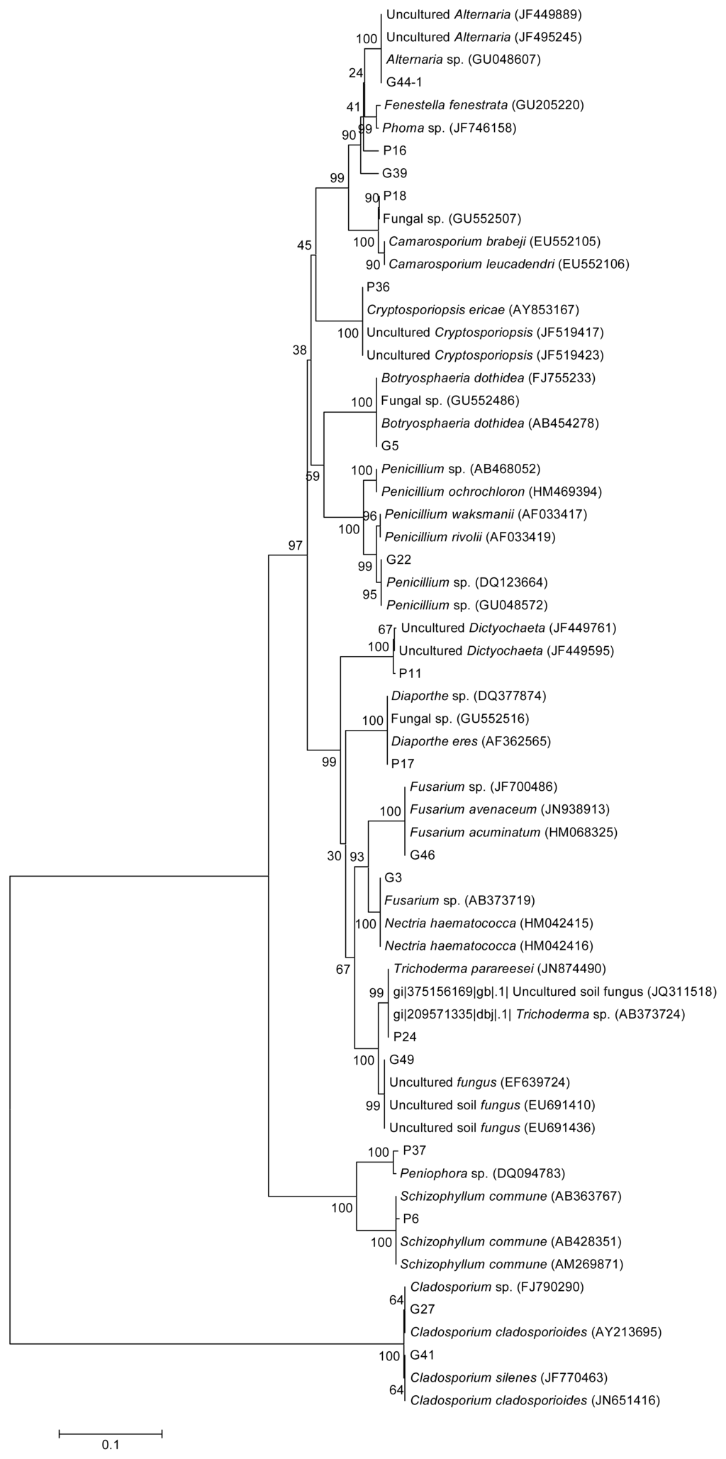 A phylogenetic tree built from the 28S rDNA sequences is shown in Figure 1. From Table 1 and Figure 1, the identified fungi included: Alternaria, Botryosphaeria, Camarosporium, Cryptosporiopsis, Diaporthe, Dictyochaeta, Penicillium, Fusarium, Nectria, Peniophora, Schizophyllum, Cladosporium and Trichoderma. The most abundant genera were Diaporthe and Alternaria with 25 and 12.5% of the total number of isolates, respectively. G49 was not identified because its sequence was significantly similar to unknown fungal sequences in the GenBank database.