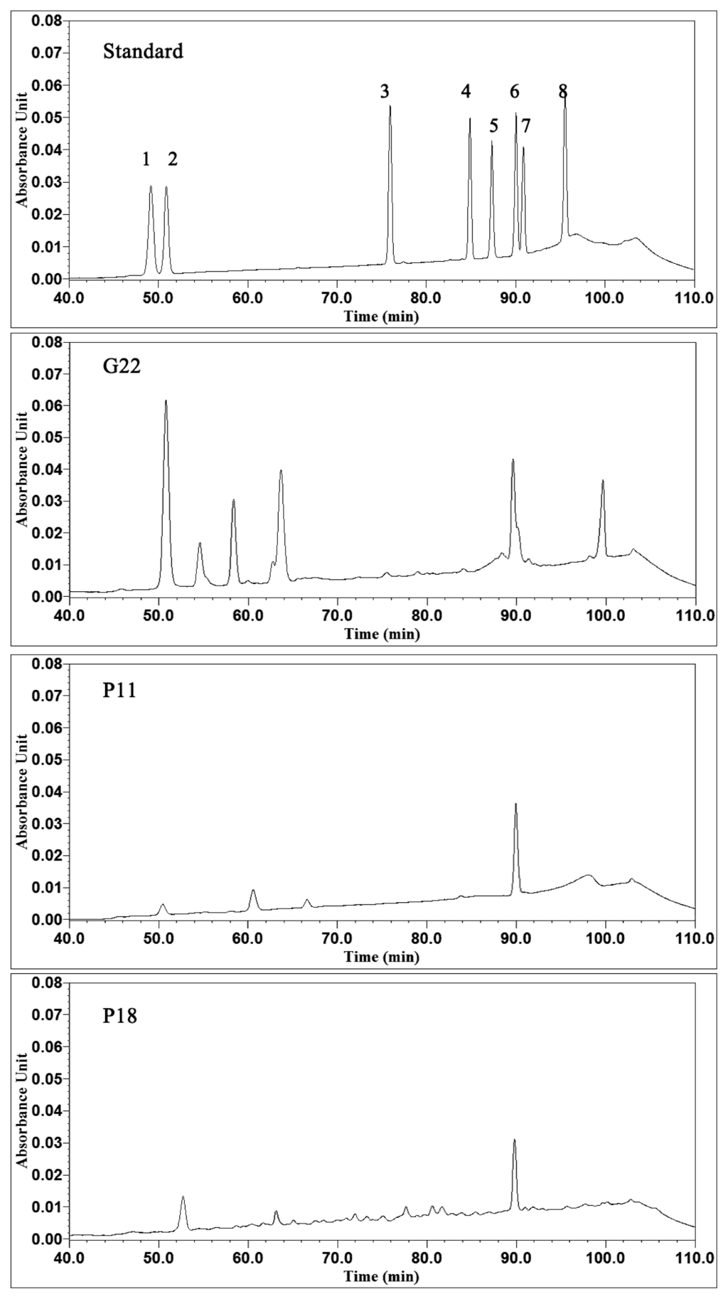 To further analyze the composition of saponins, the culture filtrates of G22, P11, and P18, underwent HPLC. As a reference, eight ginsenoside standards were also analyzed. According to the spectra, which are shown in Figure 2, G22, P11 and P18 all produced detectable concentrations of saponins. Ginsenoside Rb2 was detected in the G22, P11, and P18 culture filtrates. More peaks were observed in the G22 culture filtrate. Ginsenoside Re was also detected in the G22 culture filtrate. These results indicate that the three strains have the capacity to produce ginsenosides, especially for G22. Additionally, G22 inhibited S. aureus growth (Table 3). These results indicate that G22 has a great potential for the further detailed study.