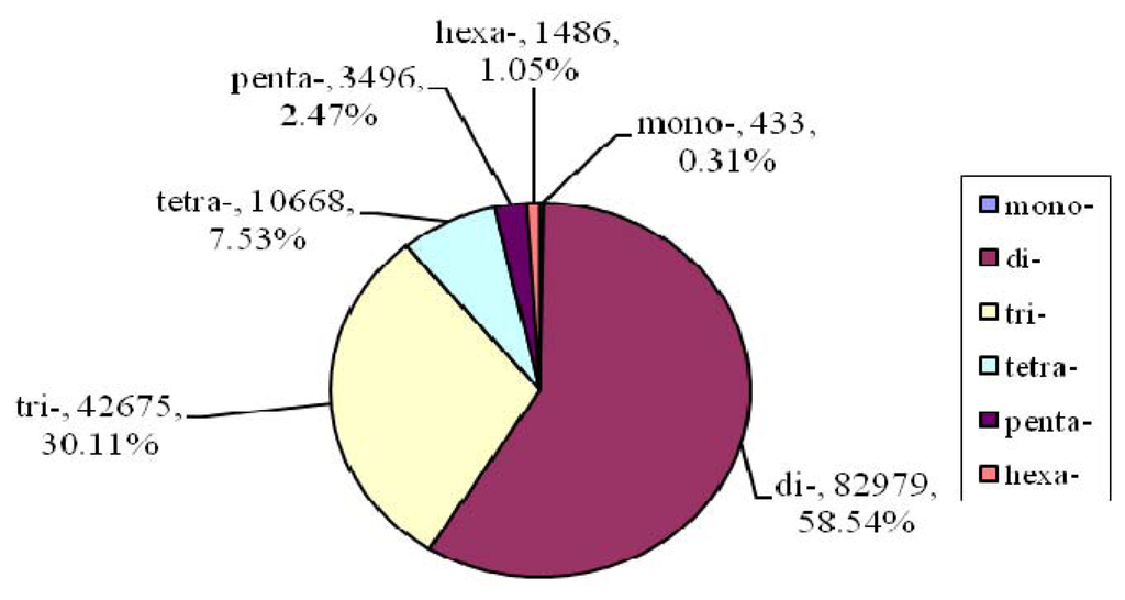 - Toth, G.; Gaspari, Z.; Jurka, J. Microsatellites in different eukaryotic genomes: Survey and analysis. Genome Res 2000, 10, 967–981. [Google Scholar]