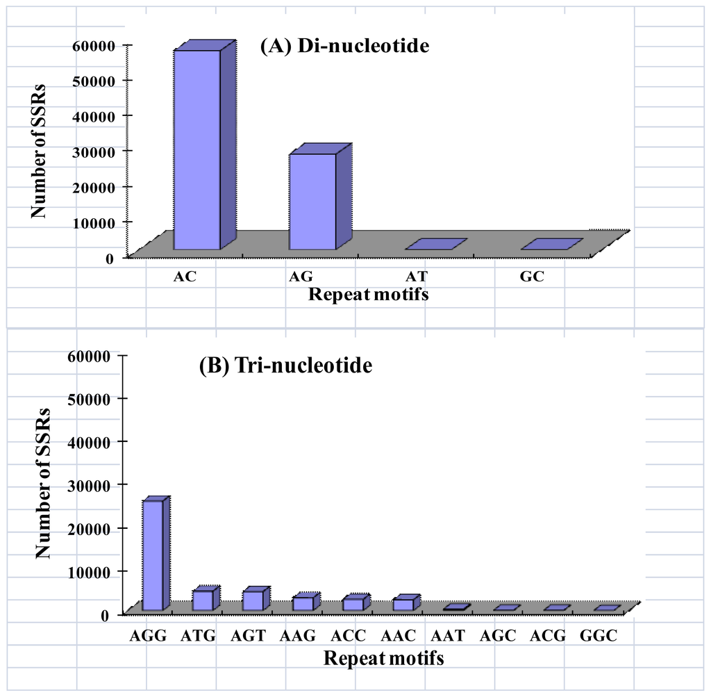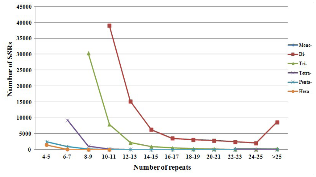 | Motif length | Repeat numbers | Total number | % | |||||||||||