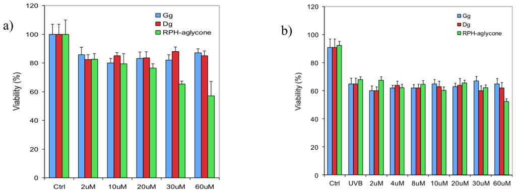 Effects of genistin, daidzin, and RPH-aglycone on the viability of unirradiated or UVB-irradiated skin cells. (a) The viability of unirradiated cells was measured with the MTT assay in BJ-5ta cells incubated either with genistin, daidzin or with RPH-aglycone (from 2 μM to 60 μM); (b) The viability of UVB-irradiated BJ-5ta cells was measured by Trypan blue staining 24 h after UVB irradiation in cells pretreated with genistin, daidzin, or RPH-aglycone. The results are reported as percentage cell viability, and the values represent the mean values ± SD of three independent experiments (Ctrl: untreated and unirradiated control cells; UVB: untreated and irradiated (60 mJ/cm2) cells).