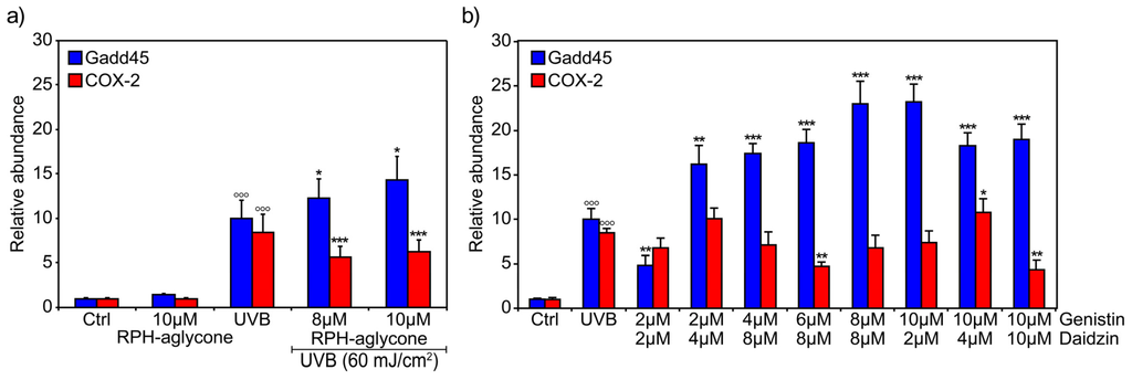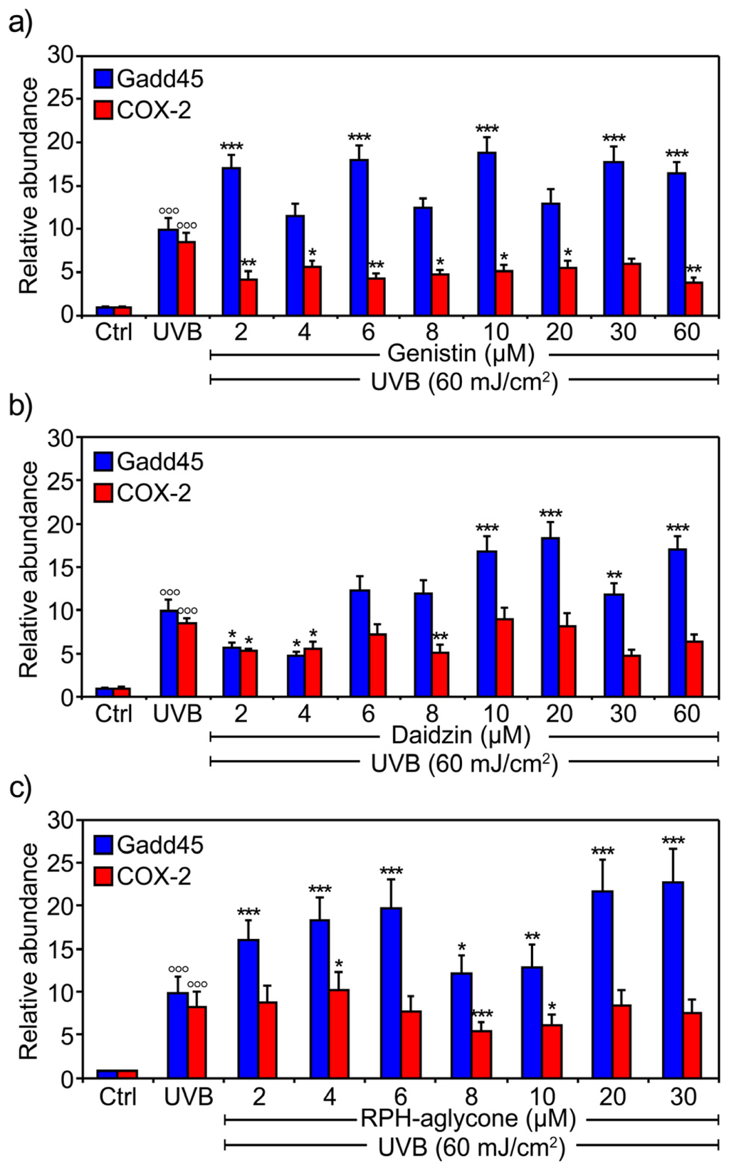 Effects of genistin and daidzin combinations and RPH-aglycone on the levels of Gadd45 and COX-2 mRNA in BJ-5ta cells irradiated with 60 mJ/cm2 UVB. Levels of Gadd45 and COX-2 mRNA were determined by real-time PCR using a total RNA preparation from BJ-5ta cells treated for 2 h with the most effective concentrations of (a) RPH-aglycone (8 μM to 10 μM) (a) or (b) with different combinations of genistin (from 2 μM to 10 μM) and daidzin (from 2 μM to 10 μM). The cells were harvested 24 h after 60 mJ/cm2 of UVB irradiation. The bars indicate the relative abundance of each mRNA; +1 is the abundance of Gadd45 and COX-2 mRNA in the unirradiated and untreated cells. All values represent the mean ± SD of triplicate experiments. *p < 0.05, **p < 0.001, ***p < 0.0001, ○○○p < 0.0001 (Ctrl: untreated and unirradiated control cells; UVB: untreated and irradiated (60 mJ/cm2) cells.