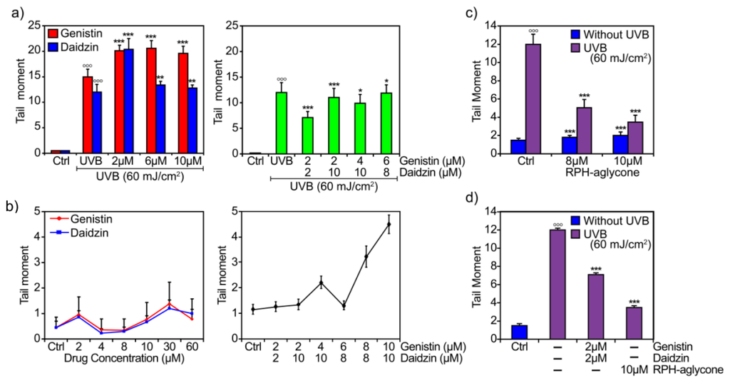 Analysis of UVB-induced DNA damage by the comet assay. (a) (left panel) BJ-5ta cells were treated for 2 h with different concentrations of genistin or daidzin (from 2 μM to 10 μM) before UVB irradiation and were harvested 24 h after UVB irradiation (60 mJ/cm2); (a) (right panel) BJ-5ta cells were treated for 2 h with different combinations of genistin and daidzin before UVB irradiation (60 mJ/cm2) and were harvested 24 h after UVB irradiation (60 mJ/cm2); (b) (left panel) BJ-5ta cells were treated for 2 h with various concentrations of genistin or daidzin (from 2 μM to 60 μM) and were harvested 24 h after treatment; (b) (right panel) BJ-5ta cells were treated for 2 h with different combinations of genistin and daidzin and were harvested 24 h after treatment; (c) BJ-5ta cells were treated with RPH-aglycone (8 μM and 10 μM) without UVB irradiation or before UVB irradiation (60 mJ/cm2) and were harvested 24 h after treatment; (d) A comparative analysis of the photo-protective effect by the comet assay of isoflavones in the aglycone (10 μM RPH-aglycone) or glucoside forms (2 μM genistin plus 2 μM daidzin) is shown. The comet assay procedure (see Experimental Section 3.7) was performed according to the manufacturer’s instructions. The results were quantified using NIH Image Software (version 1.62; NIH: Bethesda, MD, USA, 1997). The data are reported as TMs and represent the mean ± SD of three independent experiments. (Ctrl: untreated and unirradiated control cells; UVB: untreated and irradiated (60 mJ/cm2) cells).