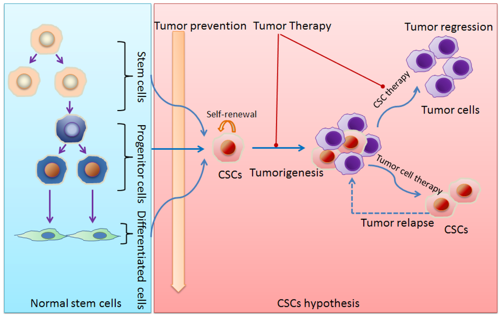 Schematic diagram of stem cells and cancer stem cells (CSCs). Left panel: Normal stem cell proliferation and differentiation. Right panel: CSCs and tumorigenesis as well as implications of CSCs for cancer therapy.