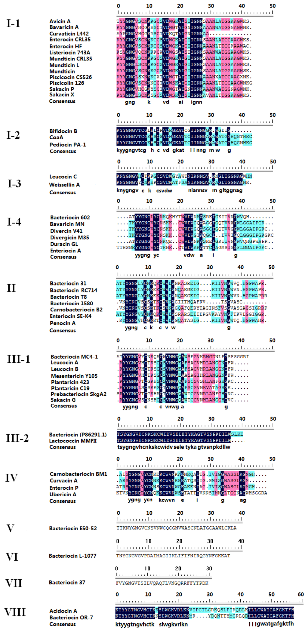 Subgroup I-2 encompasses bifidocin B, coagulin, pediocin PA-1, which are produced by B. bifidum, B. coagulans, Enterococcus faecium, Lactobacillus plantarum, Pediococcus acidilactici, Pediococcus pentosaceus and Streptococcus mutans. The common consensus of this subgroup is KYYGNGVTCGK(L)HS(D)CS(R)VDW(R)GKATT(C)C(G)IINNG.