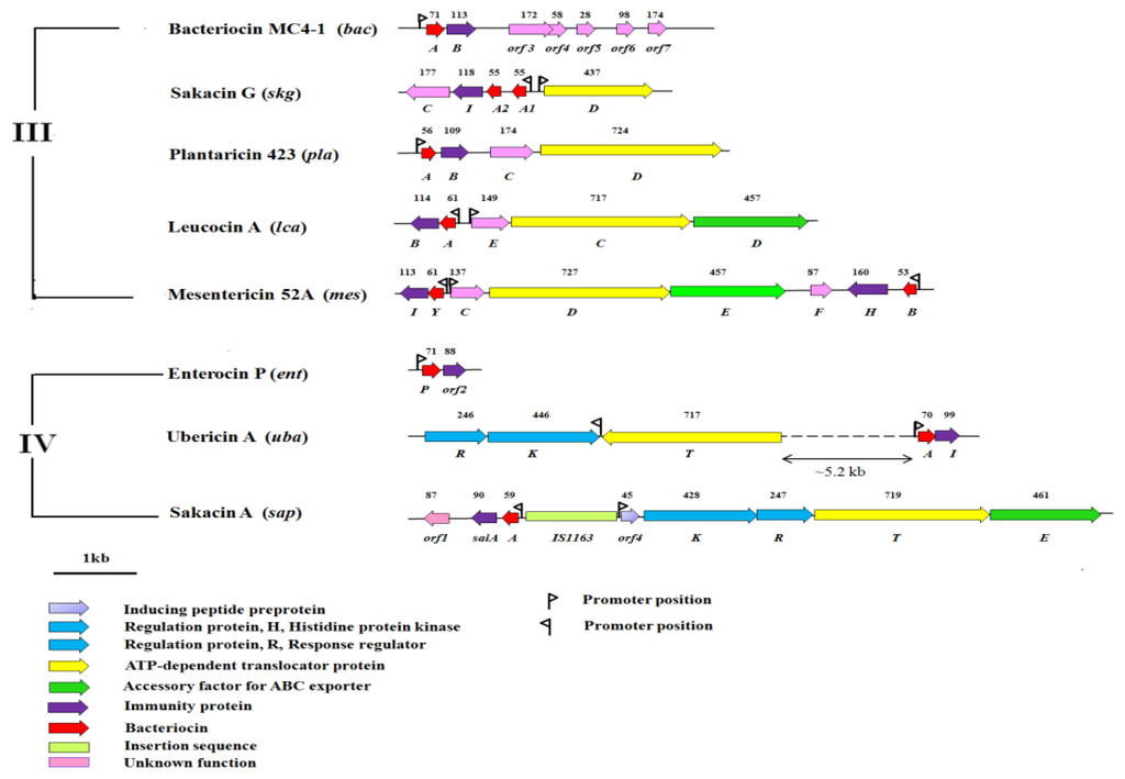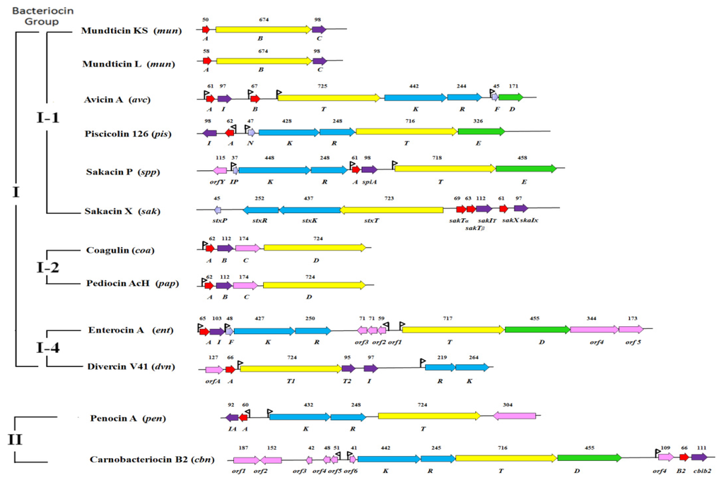 Organization of the gene clusters of class IIa bacteriocins. The figure was involved in production of avicin A in Enterococcus avium XA83 (avc, GenBank ID: FJ851402.1); bacteriocin MC4-1 in Enterococcus faecalis MC4 (bac, GenBank ID: EU047916.1); carnobacteriocin B2 in Carnobacterium maltaromaticum LV17B (cbn, GenBank ID: L47121.1); coagulin in Bacillus coagulans I4 (coa, GenBank ID: AF300457.1); divercin V41 in Carnobacterium divergens V41 (dvn, GenBank ID: AJ224003.1); enterocin A in Leuconostoc gelidum UAL 187 (ent, GenBank ID: AF099088); enterocin P in Enterococcus faecium P13 (ent, GenBank ID: AF005726.1); leucocin A in Leuconostoc gelidum UAL 187 (lca, GenBank ID: L40491.1); mesentericin 52A in Leuconostoc mesenteroides subsp. mesenteroides FR52 (mes, GenBank ID: AY286003.1); mundticin KS in Enterococcus mundtii NFRI 7393/AT06 (mun, GenBank ID: AB066267); mundticin L in E. mundtii CUGF08 (mun, GenBank ID: FJ899708.1); pediocin PA-1 in E. faecium Acr4 (pap, GenBank ID: HQ876214.1); penocin A in Pediococcus pentosaceus ATCC 25745 (pen, GenBank ID: NC_008525.1); piscicolin 126 in Carnobacterium piscicola JG126 (pis, GenBank ID: AF275938.1); plantaricin 423 in Lactobacillus plantarum 423 (pla, GenBank ID: AF304384); sakacin A in Lactobacillus sakei Lb706 (sap, GenBank ID: Z46867.1); sakacin G in Lactobacillus sakei CWBI-B1365 (skg, GenBank ID: EU570253.1) ; sakacin P in Lactobacillus sakei LTH673 (spp, GenBank ID: AF002276.1); sakacin X in L. sakei 5 (sak, GenBank ID: AAP44569.1); ubericin A in Streptococcus uberis E (uba, GenBank IDs: EF203953.1 and EF203954.1). Open reading frames (ORFs) encoding the related proteins are marked with the different color. The number of amino acid residues within each encoded protein is shown below the corresponding ORF.