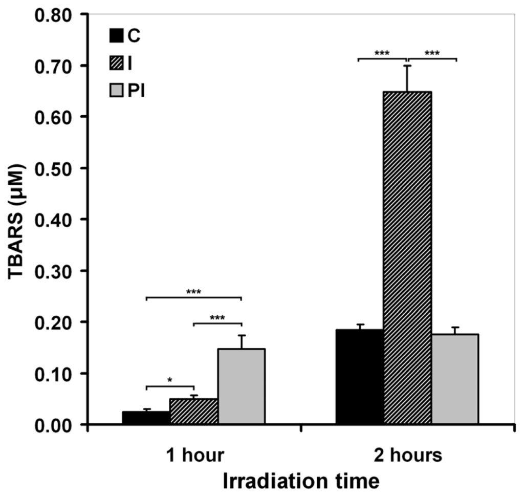 The level of TBARS released in the medium by keratinocytes exposed to UVA depends on irradiation time. C—mock-irradiated, I—just after irradiation, PI—24 h post-irradiation culture. Bars represent average values ± SD, for five experiments; *p < 0.05; ***p < 0.001.