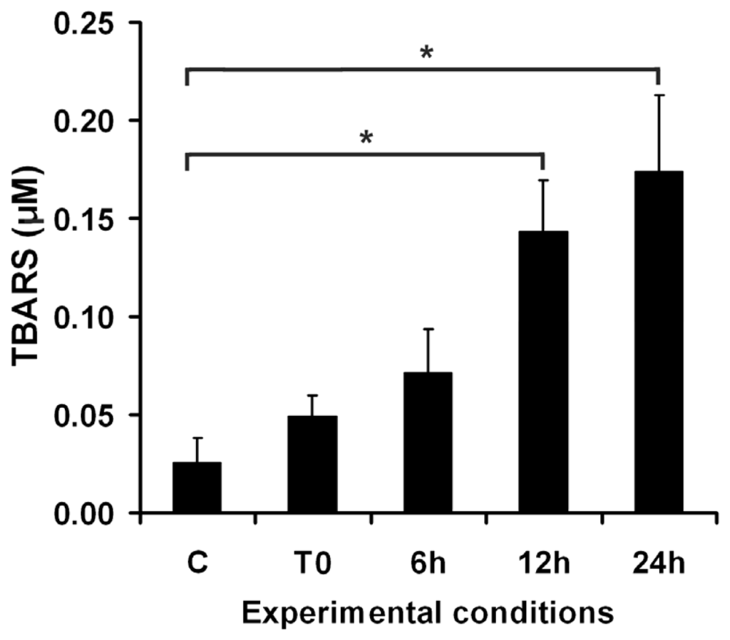 Dynamics of TBARS detected in the culture medium of DOK cells at different time intervals post-irradiation. C—mock-irradiated, T0—just after irradiation, 6 h—TBARS level in a 6 h post-irradiation DOK cell culture, 12 h—TBARS level in a 12 h post-irradiation cell culture, 24 h—TBARS in culture medium in a 24 h post-irradiation cell culture. Bars represent average values ± SD, for three experiments; *p < 0.05.