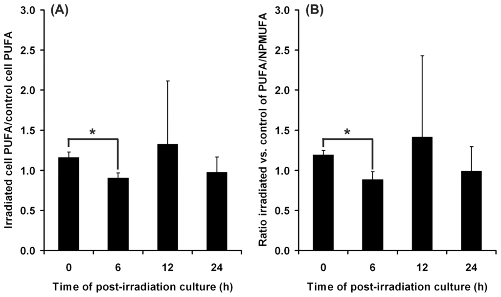 Polyunsaturated fatty acids represent a target of the lipid peroxidation process. Therefore, we investigated the changes of their content in cell lipids immediately after irradiation and post-irradiation at various time intervals (Figure 3). The level of polyunsaturated fatty acids was found to decrease significantly at 6 h post-irradiation, and then, it gradually returned toward the initial level, as evidenced by the values recorded at 12 h and 24 h, respectively (Figure 3A). A similar dynamics was obtained by examining the ratio polyunsaturated vs. non-peroxidizable fatty acids (mono-unsaturated + saturated). This ratio showed a significantly decreased value at 6 h post-irradiation, and a return to the initial level at longer post-irradiation times (Figure 3B). These results suggest the ability of the cells to trigger a protective response against UVA effects. Therefore, even though polyunsaturated fatty acids are affected by peroxidation after UVA exposure, and TBARS remains detectable 24 h post-irradiation, the level of peroxidizable fatty acids starts to be restored earlier.