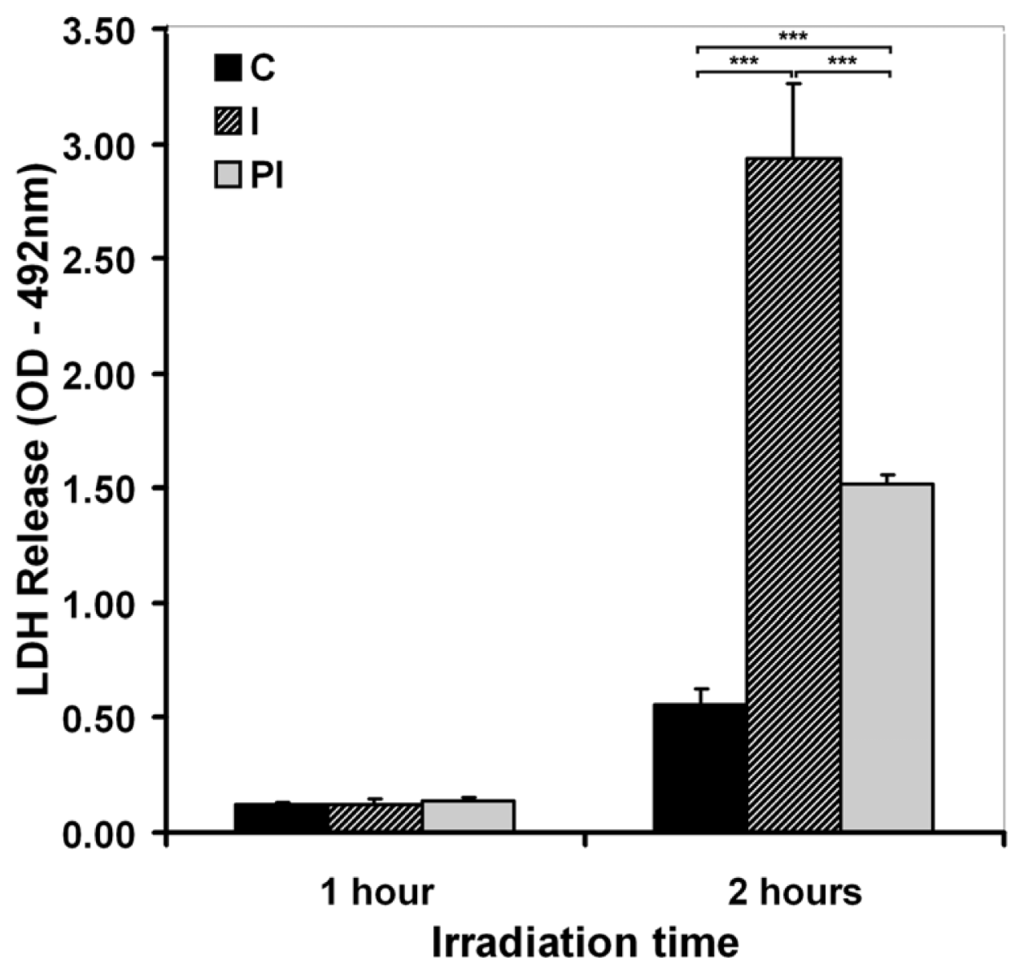 The effect of irradiation time on cellular membrane integrity, assessed by LDH release in cell culture medium. C—mock-irradiated, I—just after irradiation, PI—24 h post-irradiation culture. Bars represent average values ± SD, for five experiments; ***p < 0.001.