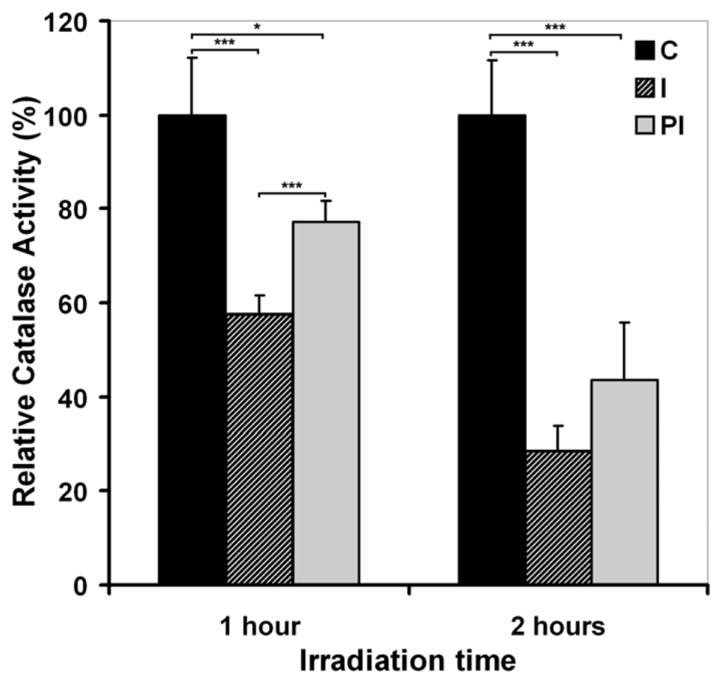 The effect of UVA irradiation on catalase activity immediately after 1 or 2 h sessions of irradiation (I) and 24 h post-irradiation (PI). Bars represent the percent of catalase activity relative to control (average ± SD, for 3 experiments); *p < 0.05; ***p < 0.001.