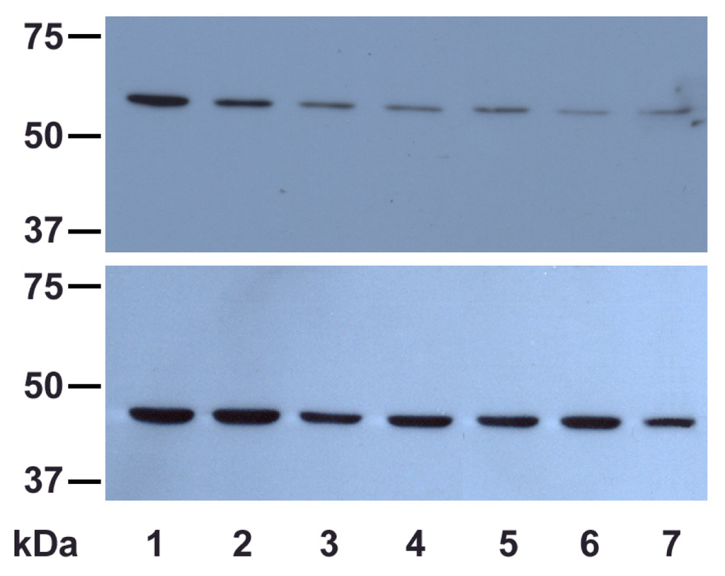 The effects of different UVA exposure times on the expression level of catalase in DOK cells (top) at various post-irradiation time intervals; β-actin loading control (bottom). 1—mock-irradiated cells; 2—irradiated cells (30 min exposure) just after irradiation; 3—irradiated cells (1 h exposure) just after irradiation; 4—irradiated cells (2 h exposure) just after irradiation; 5—irradiated cells (30 min exposure) at 24 h post-irradiation; 6—irradiated cells (1 h exposure) at 24 h post-irradiation; 7—irradiated cells (2 h exposure) at 24 h post-irradiation.