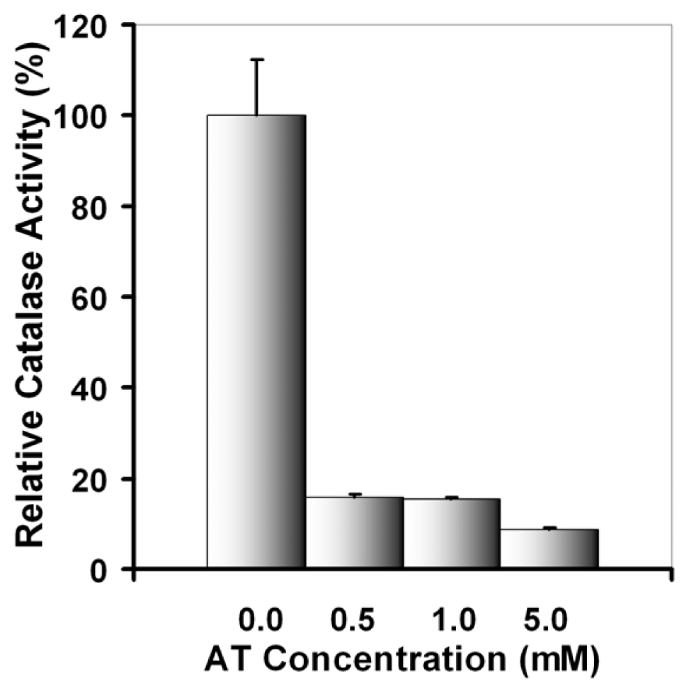 To test the significance of catalase activity in cell response to UVA damage, experiments triggering inhibition of catalase were designed. To this end, we used a specific inhibitor of catalase, 3-amino 1,2,4-triazole (AT), that irreversibly inactivates the catalytic activity []. This inhibitor does not affect the de novo synthesis of catalase [].