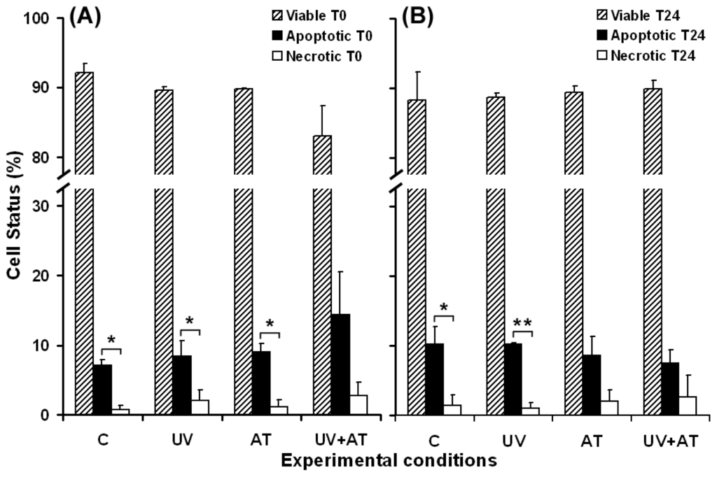 Flow cytometry data regarding cell viability, apoptosis and necrosis induced in DOK cells by 1 h UVA exposure with or without 1 mM aminotriazole (AT) treatment. (A) apoptosis and necrosis just after treatment; (B) apoptosis and necrosis in surviving DOK cells at 24 h post treatment. C—mock-irradiated cells; UV—irradiated cells; AT—cells treated with AT; UV + AT—cells treated with AT and UVA irradiated. Bars represent the percent of gated cells in three experiments; *p < 0.05; **p < 0.01.