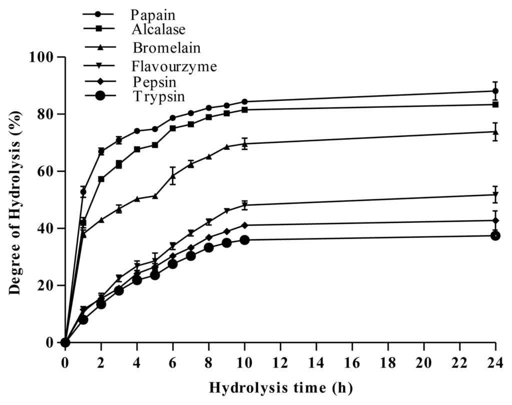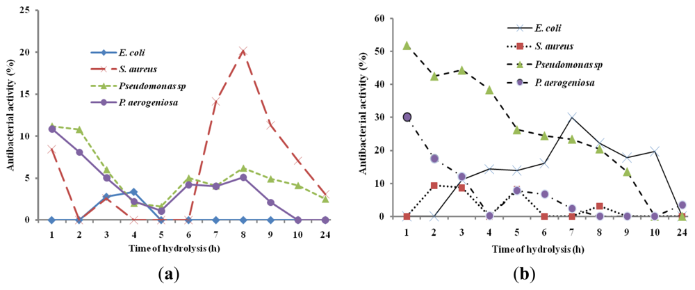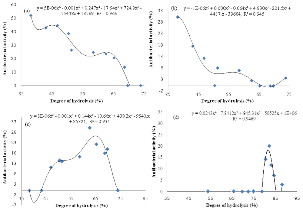 2.4. Relationship between Degree of Hydrolysis and Antibacterial Activity