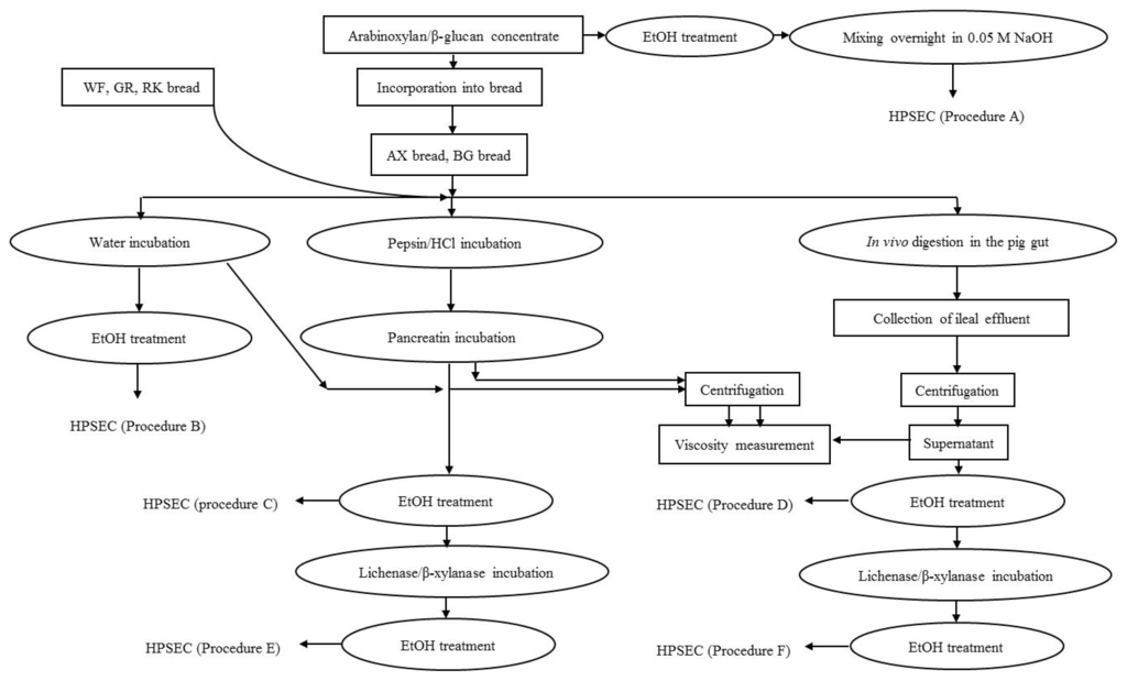During mixing, yeast fermentation and baking the DF polysaccharides provided as ingredients in the flour may change regarding molecular weight distribution and polydispersity [1]. Changes in the molecular weight and concentration of soluble DF influence the extract viscosity, which may have an impact on the functional properties of the breads and thereby on the physiological responses when consumed by monogastric mammals. As the gastrointestinal tract and physiological responses of pig are very similar to humans, the pig was used as a monogastric model providing access to digestive material that is difficult to obtain from humans. The aim of this investigation was to study the fate of polysaccharides in breads with variable content and structure of fiber constituents before and after in vitro and in vivo pig small intestinal digestion using different extraction procedures as illustrated in Figure 1.