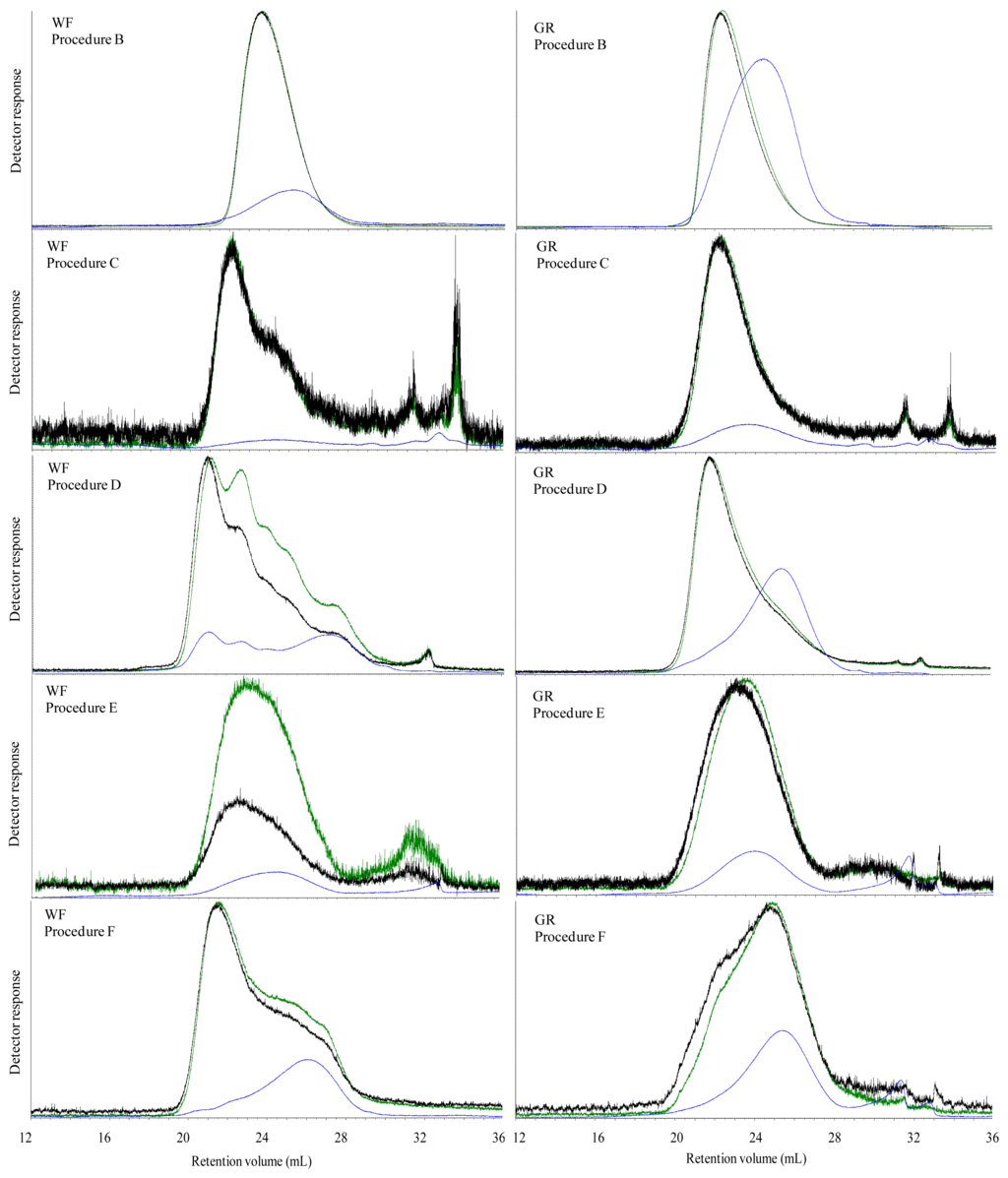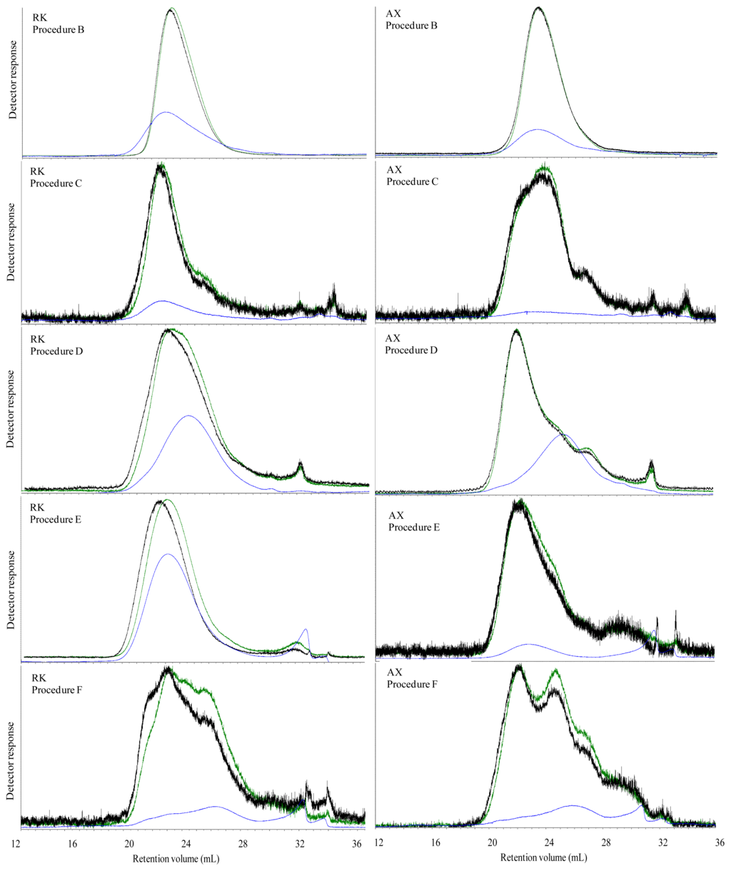 - Pitkanen, L.; Virkki, L.; Tenkanen, M.; Tuomainen, P. Comprehensive multidetector HPSEC study on solution properties of cereal arabinoxylans in aqueous and DMSO solutions. Biomacromolecules 2009, 10, 1962–1969. [Google Scholar]