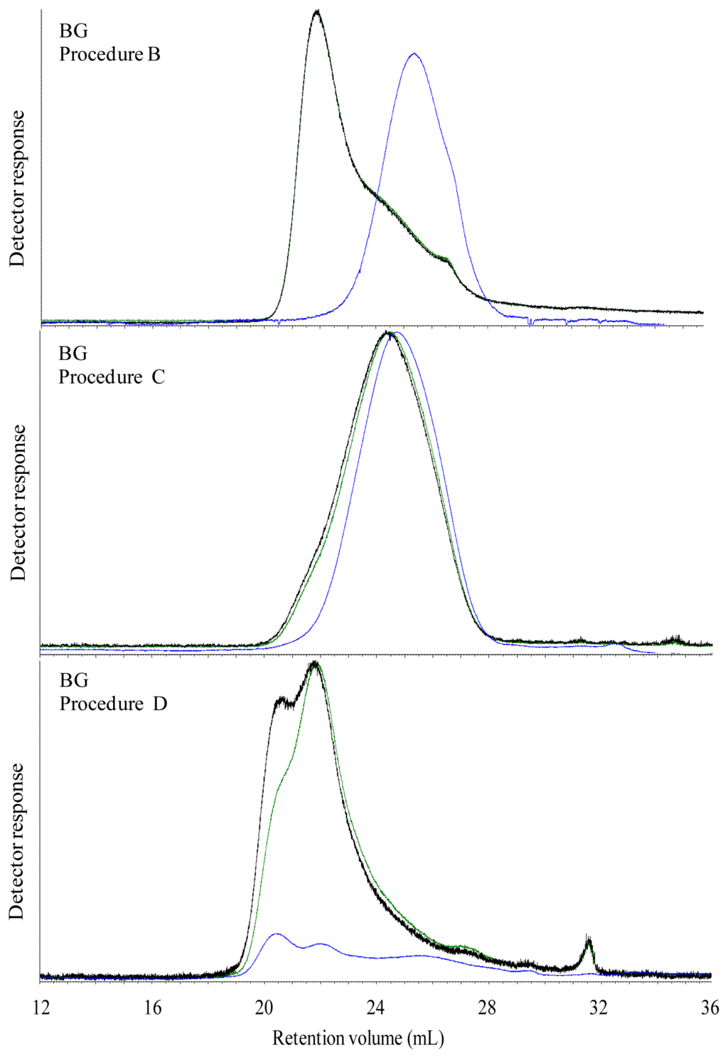 Size exclusion chromatography with RALLS (green), LALLS (black) and intrinsic viscosity (blue) signal of extracts of water extracted (procedure B), in vitro digested (procedure C), and in vivo digested (procedure D) BG bread.