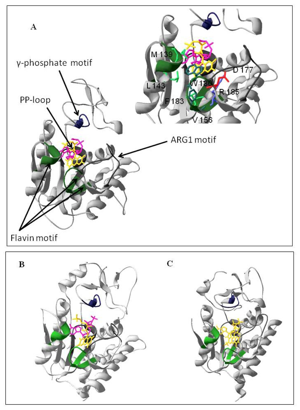 To identify which of the two domains of hFADS is responsible for FAD synthesis starting from FMN, a multi-alignment was performed among the hFADS1 (defined as the “canonical” sequence by UniprotKB), FMN adenylyltransferase from C. glabrata and Fad1p from S. cerevisiae. The alignment showed a consensus sequence of 64 amino acids (corresponding to 24% of the sequences lengths) among the 329–587 region of hFADS1 and the other two proteins (Figure 1). The most conserved regions of the proteins, which should be important for the catalysis, correspond to the PP-loop, the ARG1 loop, the flavin and the γ-phosphate motifs (Figure 1). On the basis of the 28% pair-wise identity, the homology model of the PAPS reductase domain was built using as a template the FMNAT of C. glabrata (PDB code: 3G5A) (Figure 2). The model was geometrically validated by MolProbity web service (MolProbity score: 2.98) [19]. In this structure the PP-loop, the ARG1 loop, the flavin and the γ-phosphate motifs, which correspond to the conserved region, are highlighted. The predicted location of FMN and AMPCPP and the relationships with the enzyme are shown. The isoalloxazine ring is in the middle of the predicted flavin motif, which is composed largely of loops (64%) interlaced by α6–α9 helices and two short 310-helices. The folding of the PAPS reductase domain resembles those of the related enzymes FMNAT of C. glabrata and Fad1p from S. cerevisiae (Figure 2B,C), in agreement with the rmsd value of 1.10 Å for 163 superimposed Cα atoms of the PAPS reductase domain (from Q70 to K232) on FMNAT of C. glabrata, calculated by Swiss-PdbViewer 4.0.1. (Swiss Institute of Bioinformatics: Lausanne, Switzerland). The structure has a prevailing α/β fold with central β-sheets surrounded by α-helices, and the region containing the active site seems to be conserved in the three enzyme structures as it appears from the comparison of Figure 2A with Figure 2B,C. The small segment containing the γ-phosphate motif has a higher random coil content, thus appearing less similar to the related enzymes of C. glabrata and S. cerevisiae. In analogy to the FMNAT of C. glabrata[9], several residues are involved in the interaction with the isoalloxazine ring, including the aromatic W180 and F183, the hydrophobic M139, L143 and V156 and the hydrophilic D177 and R185 (inset to Figure 2A).