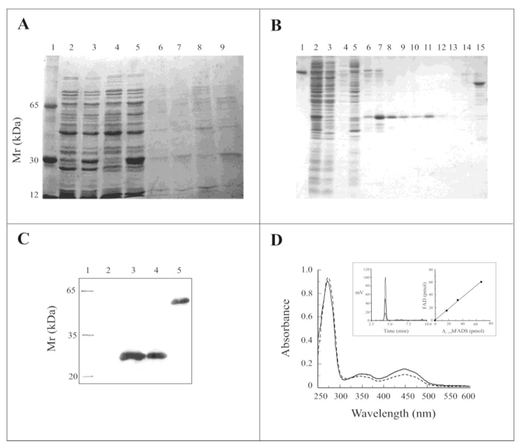 Expression, purification and spectroscopic properties of recombinant 6-His-Δ1-328-hFADS. (A) Proteins were separated by SDS-PAGE on a 15% gel and stained with Coomassie Blue. Lane 1, molecular weight markers; lane 2, un-induced supernatant after 2 h growth; lane 3, IPTG-induced supernatant after 2 h growth; lane 4, un-induced supernatant after 4h growth; lane 5, IPTG-induced supernatant after 4h growth; lanes 6–9, corresponding insoluble fractions of the sample of lanes 2–5; (B) Protein fractions obtained by Ni2+-chelating chromatography were separated by SDS-PAGE on a 15% gel and stained with Coomassie Blue. Lane 1, BSA (2 μg); lane 2, IPTG-induced supernatant (20 μg); lane 3, first flow through fraction (19.8 μg); lane 4, second flow through fraction (4 μg); lane 5, proteins eluted with 50 mM imidazole (27.7 μg); lane 6, first fraction of proteins eluted with 150 mM imidazole (0.8 μg); lane 7, second fraction of proteins eluted with 150 mM imidazole (4 μg); lane 8, third fraction of proteins eluted with 150 mM imidazole (2.5 μg); lane 9, fourth fraction of proteins eluted with 150 mM imidazole (1.5 μg); lane 10, first fraction of proteins eluted with 400 mM imidazole (1.3 μg); lane 11, second fraction of proteins eluted with 400 mM imidazole (2.4 μg); lane 12, third fraction of proteins eluted with 400 mM imidazole (0.3 μg); lane 13, fourth fraction of proteins eluted with 400 mM imidazole (0.3 μg); lane 14, fraction of proteins eluted with 500 mM imidazole (0.3 μg); lane 15, fraction of the 6-His-hFADS2 eluted with 400 mM imidazole (2.6 μg); (C) Analysis by immunoblotting of purified 6-His-Δ1-328-hFADS. Lane 1, molecular mass marker; lane 2, BSA (2 μg); lane 3, fraction 7 of (B); lane 4, fraction 11 of (B); lane 5, 6-His-hFADS2; (D) The spectra of either 6-His-Δ1-328-hFADS (continuous line, 15.9 μM) or 6-His-hFADS2 (dashed line, 11.7 μM) were recorded in 40 mM Hepes/Na, 5 mM β-mercaptoethanol, pH 7.4. In the inset, the purified 6-His-Δ1-328-hFADS (3.8 μM) was treated with 10% perchloric acid. The supernatant was neutralized, and aliquots were analyzed by HPLC for flavin content and reported versus protein monomer amount.