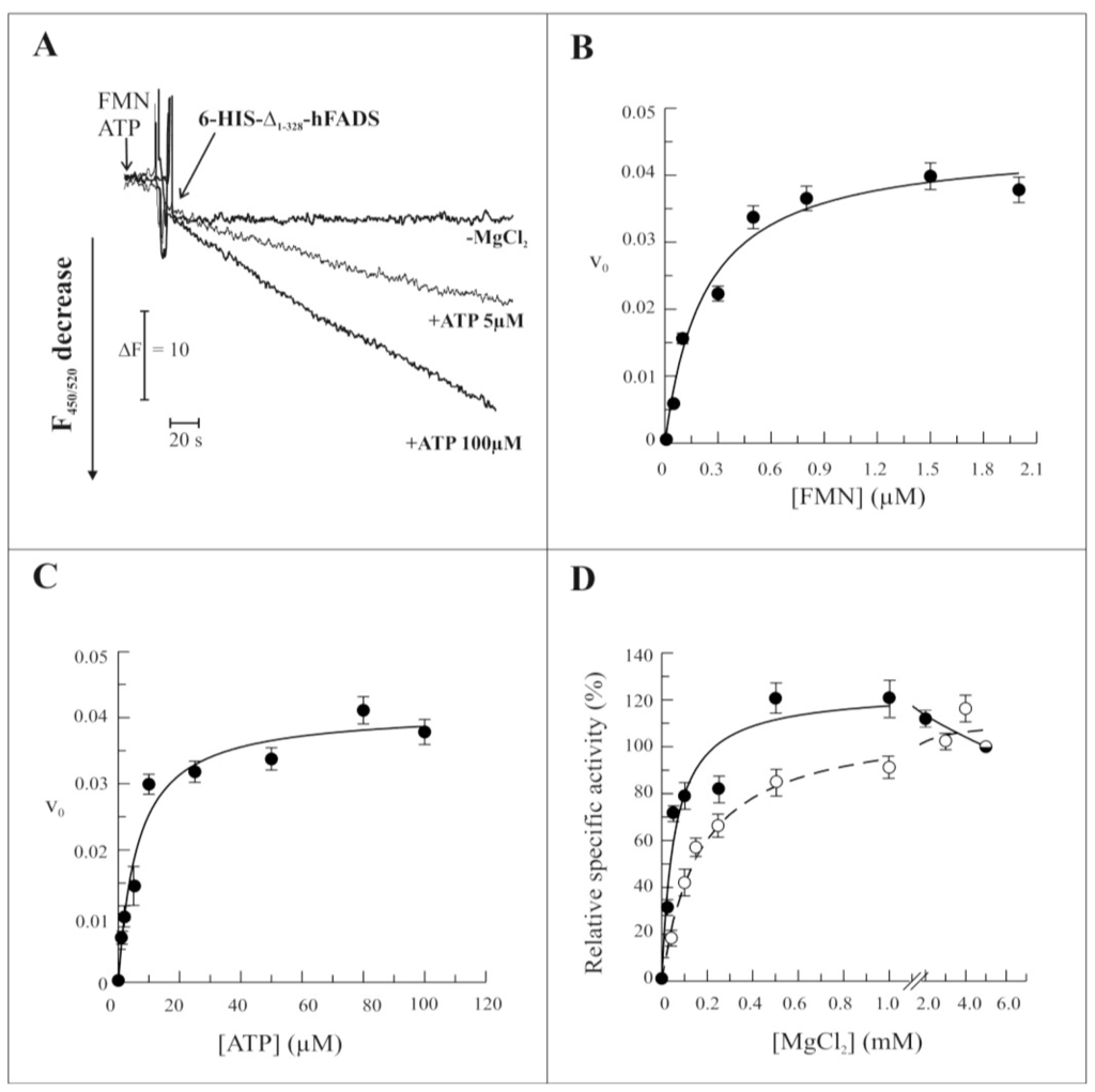 The ability of the recombinant Δ1-328-hFADS to catalyze FAD synthesis was demonstrated and the rate of reaction measured by following flavin fluorescence decrease in the presence of the substrates FMN and ATP, essentially as in [15]. As expected, the reaction rate depended on the ATP concentration, being more than double at 100 μM with respect to 5 μM ATP (Figure 4A). As in the case of the entire hFADS2 and of the yeast enzyme [20], the recombinant Δ1-328-hFADS required the presence of MgCl2 (Figure 4A). The kinetics of the reaction were studied as a function of the concentration of FMN, ATP and MgCl2 (Figure 4, panels B–D). The dependence of the reaction rate on FMN and ATP concentrations showed saturable behaviors similar to those previously found for the wild-type protein [15], and the experimental data could be fitted by the Michaelis–Menten equation with half saturation constants (Km) of 0.24 ± 0.06 μM and 6.23 ± 1.5 μM for FMN and ATP, respectively, and with a kcat value of 0.041 s−1 (Figure 4B,C). An average Kcat value of 0.042 ± 0.001 s−1 was calculated from four experiments, performed with different protein preparations. The dependence of the reaction rate on the concentration of MgCl2 of Δ1-328-hFADS showed an increased sensitivity towards the divalent cation to the wild-type protein (dashed line), with 50% of maximum activity (Mg2+50) at 0.05 mM and maximal activity at 0.5–1.0 mM. The distinctive feature of the recombinant Δ1-328-hFADS was a decrease of synthesis rate at higher MgCl2 concentrations (Figure 4D).