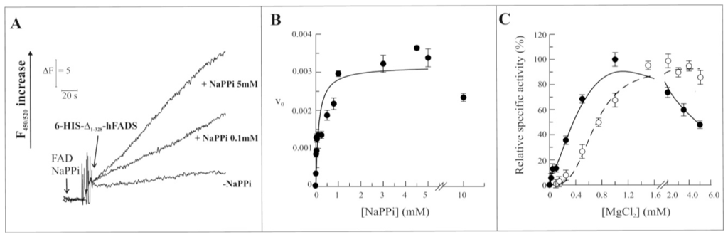 As in the case of the entire hFADS2 [15], the recombinant Δ1-328-hFADS is able to catalyze the reverse reaction. The pyrophosphorolitic activity was also measured in the presence of the substrates FAD and NaPPi. An increase of fluorescence was detected as due to the formation of FMN (Figure 5A). The dependence of FAD pyrophosphorolytic rate on NaPPi concentration was studied, and also in this case, data could be fitted in the Michaelis-Menten equation with a Km of 92.0 ± 0.5 μM and with a kcat value of 0.0032 s−1 (Figure 5B). An average Kcat value of 0.0037 ± 0.0009 s−1 was calculated from four experiments, performed with different protein preparations. At concentrations of the substrate above 4 mM, the activity slightly decreased to a value corresponding to about 80% of the maximal rate at 10 mM NaPPi. Similarly to the forward reaction, the dependence of the pyrophosphorolytic rate on the MgCl2 concentration (Figure 5C) catalyzed by the recombinant Δ1-328-hFADS (continuous line) was sensibly different from the entire hFADS2 (dashed line). In this case the sigmoidal shape of the Mg2+ dependence of the wild-type protein was transformed in a hyperbolic one with Mg2+50 of about 0.2 mM. Moreover, the rate of the reverse reaction, catalyzed by the recombinant Δ1-328-hFADS, decreased at MgCl2 concentrations above 1 mM. The reduction of reaction rate was even more evident than in the forward reaction with an activity at 5 mM MgCl2 of about half with respect to the maximal one, at 1 mM MgCl2.