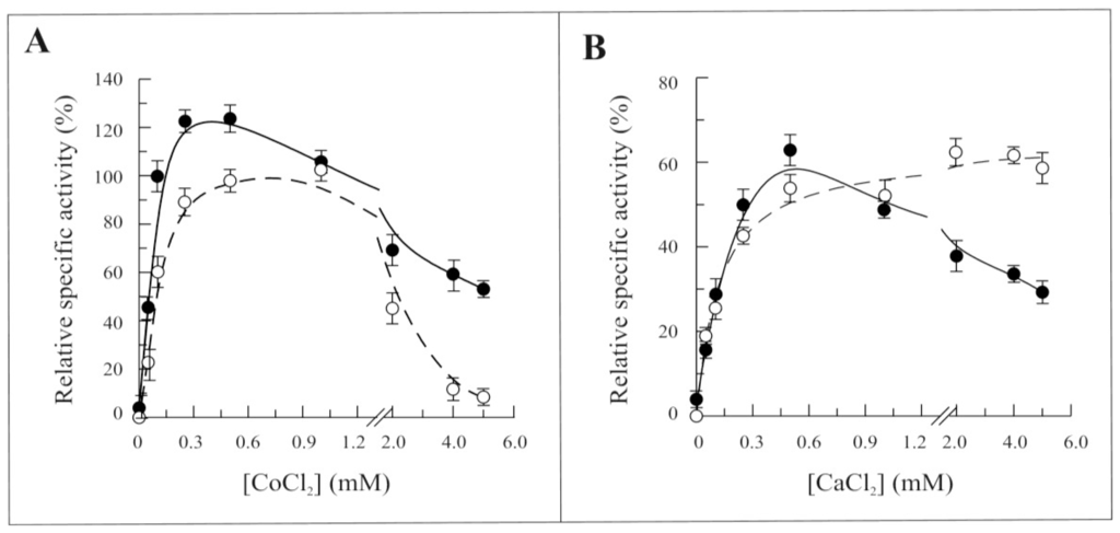 The dependence of the FAD synthesis reaction rate on the concentration of CoCl2 or CaCl2 was studied in the absence of MgCl2 (Figure 6A,B, respectively). Both Co2+ and Ca2+ were able to substitute Mg2+, Co2+ being more effective than Ca2+. The dependence of the reaction rate on the concentration of both these cations resembled that of MgCl2 up to about 0.5 mM concentration, with an increased sensitivity towards the Co2+ shown by Δ1-328-hFADS. At higher concentrations of CoCl2, the activity drastically decreased to less than 50% of the maximal for the recombinant Δ1-328-hFADS, while for the entire hFADS2, the activity was completely abolished. A similar decrease in the reaction rate was observed with CaCl2 for the recombinant Δ1-328-hFADS (continuous line), but not for the wild-type enzyme (dashed lines).