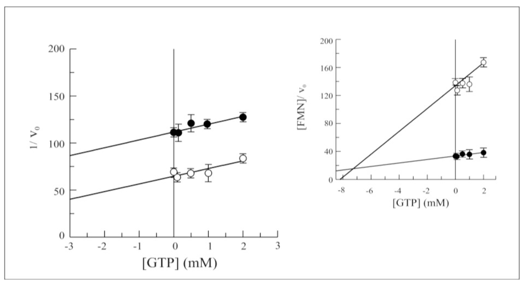 As previously observed for the wild-type protein [15], the purine nucleotides GTP and GDP were found to inhibit FAD synthesis rate. The effect of both these nucleotides was tested on the rate of the forward reaction catalyzed by Δ1-328-hFADS. While no significant changes were found in competitive inhibition by GDP (data not shown), the Dixon plot reported in (Figure 7) demonstrated that Δ1-328-hFADS is less sensitive towards the uncompetitive inhibition by GTP, with a Ki value equal to 7.5 mM (see inset to Figure 7), i.e., four times higher than that measured for the wild-type enzyme.