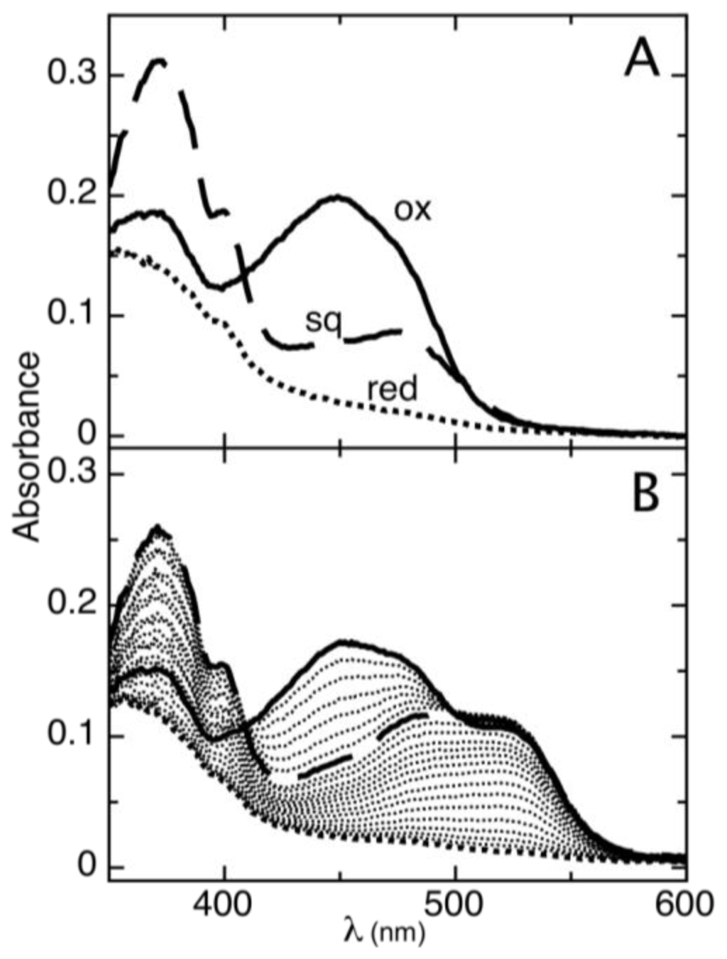 To analyze the first step of reduction, we measured the maximum amount of semiquinone intermediate formed during the experiment (Figure 3). This fraction corresponds to the semiquinone formation constant (Ksq, Equation 1) according to Equation 2 as derived by Clark [24]. Ksq reflects the difference in midpoint potentials of the two single-electron redox transitions as shown in Equation 3.