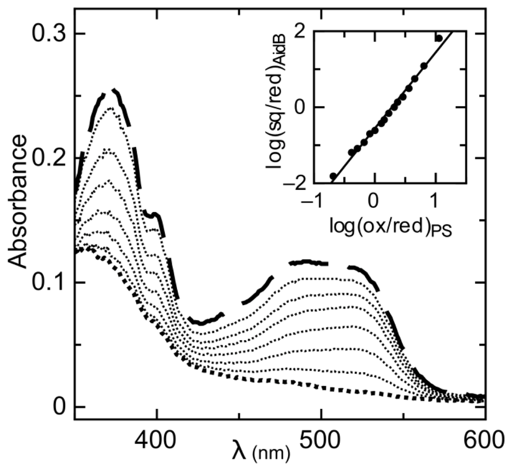 Simultaneous reduction of the AidB anionic semiquinone and PS. The visible absorbance spectra for the anionic semiquinone (monitored at 406 nm) and PS (monitored at 555 nm) decrease during their reduction. Inset: Plot of log [ox]/[red] for PS vs. log [sq]/[red] for AidB, used to calculate the midpoint potential with respect to the reference value of PS (−283 mV, pH 8).