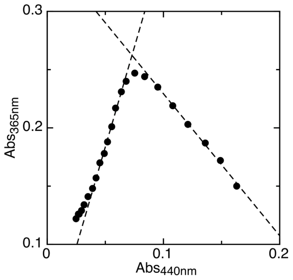 Maximum proportion of semiquinone formed by AidB during reduction is determined by plotting absorbance values at 365 nm vs. 440 nm. The linear fits, shown as dashed lines, are used to determine the theoretical absorbance of complete semiquinone formation.