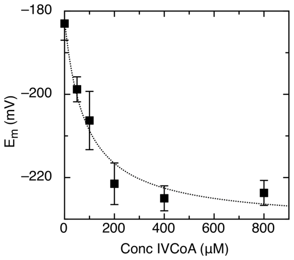 Midpoint reduction potential (Em) of AidB lowers as a function of isovaleryl-CoA (IVCoA) concentration. The dotted line is the fit to equation 4 to determine Kdapp.