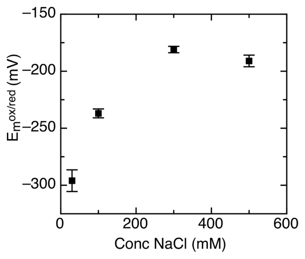 It has been shown that AidB binds DNA using its C-terminal positively charged domain [18]. Due to the electrostatic nature of this interaction, it is highly dependent on ionic strength [17,18,21]. To measure changes in redox properties when AidB is exposed to DNA, the reduction potential had to first be characterized without DNA in the presence of 100 mM NaCl, which is a concentration of NaCl where AidB is known to have a high affinity for DNA [17,21]. Compared to 300 mM NaCl in earlier measurements, lowering the NaCl concentration to 100 mM shifts the reduction potential to significantly more negative values. At 100 mM NaCl, reduction potentials are: Emox/sq = −160 ± 6 mV and Emsq/red = −315 ± 4 mV, with no change in the amount of semiquinone formed. Further studies at a broader NaCl range showed that below 300 mM NaCl, the AidB reduction potential depends strongly on NaCl concentration (Figure 5).
