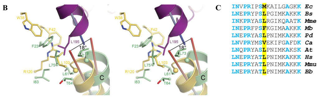 Model of the docking between AidB and the human ETF. (A) Side-by-side views of the AidB-ETF docking model (left) and the MCAD-ETF complex structure (right), shown in the same orientation. For the docking, the crystal structure of AidB (PDB ID: 3U33 [21]) was superimposed onto the MCAD-ETF complex structure (PDB ID: 1T9G [29]). All structures are shown in ribbon representation, with the ETF in red, AidB protomers in yellow and orange, and MCAD protomers in dark and light green. Only one dimer is shown both for the AidB tetramer and the MCAD tetramer, the second dimer is omitted for clarity in both cases. Transparent surfaces are shown around all proteins in red (ETF), yellow (AidB) and green (MCAD). Bound FAD-cofactors of AidB and MCAD are shown in ball-and-stick representation with carbon atoms in light green and orange, respectively. The ETF recognition loop is shown in purple and interacting hydrophobic residues of AidB and MCAD are shown as orange and green spheres, respectively; (B) Wall-eyed stereo view of the ETF recognition loop interactions. The docking was generated in the same fashion as in (A). The recognition loop is shown in purple ribbons, with Leu195 shown as sticks. MCAD residues from the MCAD-ETF complex structure that are interacting with the recognition loop are shown with pale green carbons. AidB residues near the putative location of ETF Leu195 are shown with yellow carbons. The axes of the recognition loop helix, MCAD helix C, and the corresponding AidB helix are shown and colored by dipole moment from blue (positive) to red (negative); (C) Multiple sequence alignment of ETFs from different organisms. The residue that inserts into the hydrophobic pocket of partner proteins is highlighted in yellow. Other conserved residues are shown in blue. Ec, E. coli (protein YdiQ); Bs, Bacillus subtillis; Mme, Methylophilus methylotrophus; Mb, Mycobacterium bovus; Pd, Paracoccus denitrificans; Ca, Clostridium acetobutylicum; At, Arabidopsis thaliana; Hs, Homo sapiens; Mmu, Mus musculus; Bb, Bos bovus.