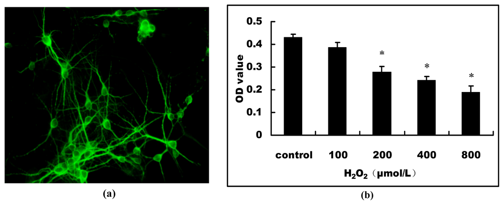 The effect of H2O2 on the cell viability of mouse primary hippocampal neurons. (a) Primary hippocampal neurons grown for 7 DIV were immunostained for MAP-2; (b) Cell viability was assessed at 24 h after stimulation with different concentrations (0, 100, 200, 400 and 800 μmol/L) of H2O2 by MTT assay. * p < 0.05 versus control.