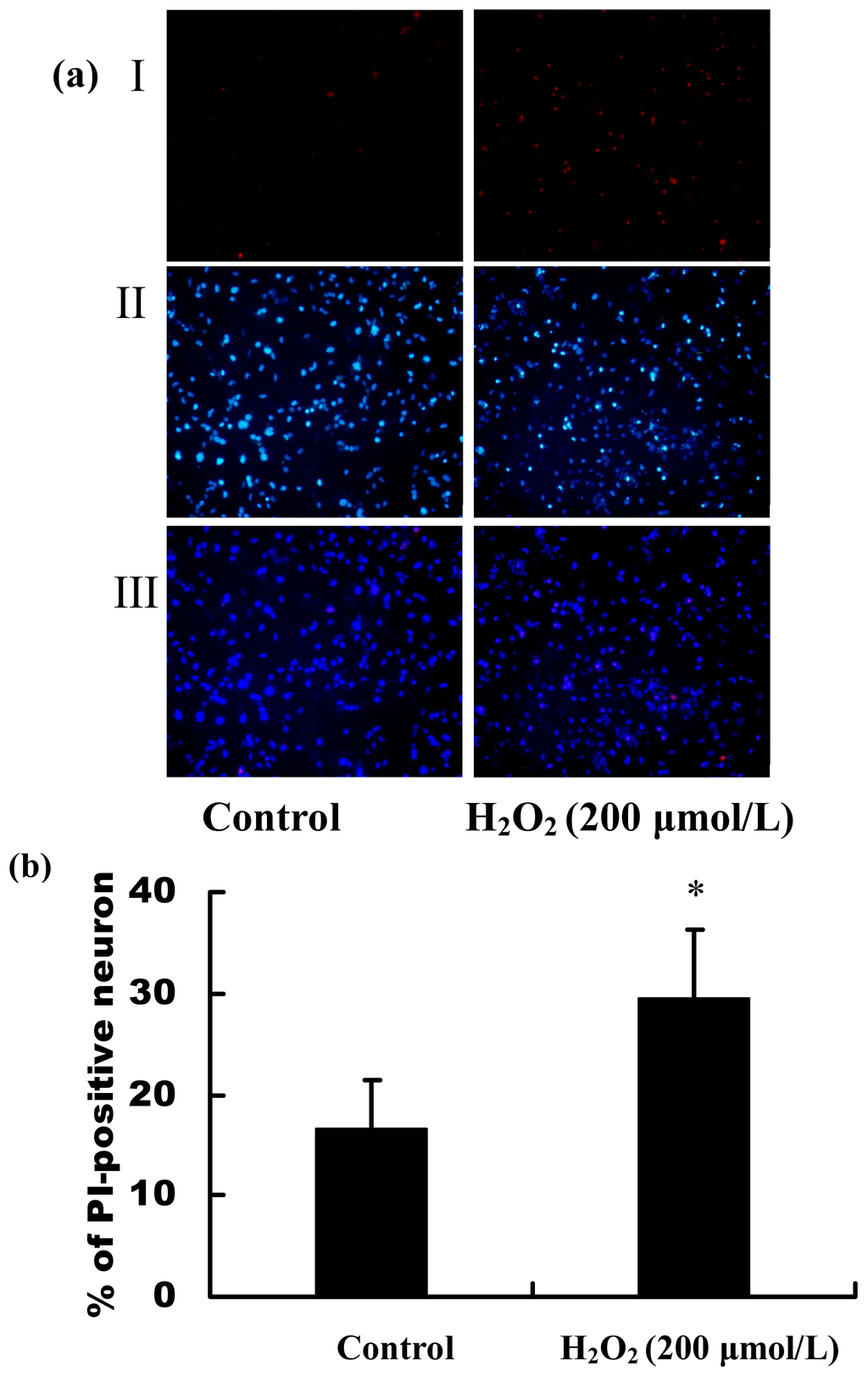 The death percentage of primary hippocampal neurons induced by H2O2. Cells were stained with PI and Hoechst 33258 after stimulation with 200 μmol/L H2O2 for 24 h. (a) Morphological cell death was determined by PI staining. Red stained cells were PI-positive cells (I). All nuclei were stained with Hoechst 33258 (II). The merge of I and II is III (200×); (b) The ratio of PI -positive primary hippocampal neurons to the total cells. * p < 0.01 versus control. The images shown are representative images.