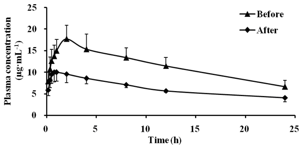 The pharmacokinetic profiles of dapsone before and after oral administration of Schizonepetin for seven days were shown in Table 1 and Figure 2. Compared with pre-administration, the Tmax of dapsone was significantly decreased from 2.10 h to 0.85 h, the Cmax was significantly decreased (0.57 times of the control group), the AUC0–t was reduced 37%, and the half-life time was 1.22 times of the control group, the CL increased by 63%. Our results indicated that CYP3A1/2 activity significantly induced by Schizonepetin after multiple oral administrations in rats.