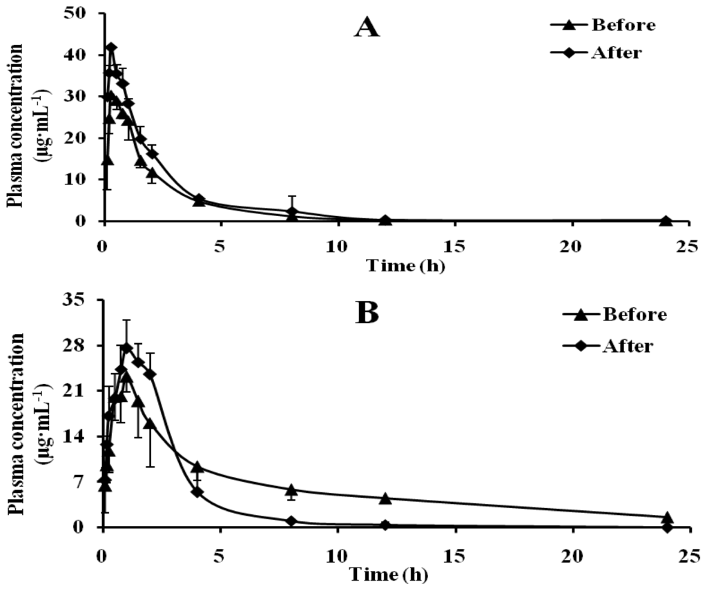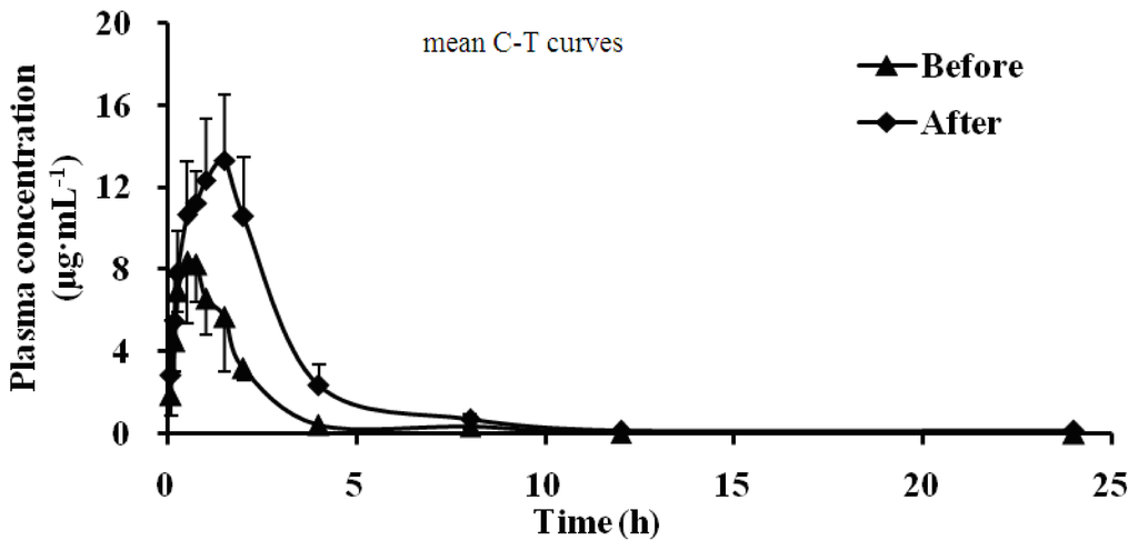 The pharmacokinetic parameters were calculated by pharmacokinetics program (Version Kinetica 4.4.1 edited by the Thermo Electron Corp, (Philadelphia, PA, USA, 2007). All data were presented as the mean ± SD. T-test was employed to determine the difference of pharmacokinetic parameters data between the two groups, for all analyses, p < 0.05 was considered statistically significant.