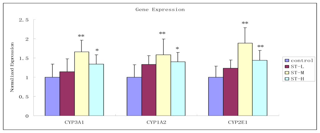 Effect of Schizonepetin on mRNA expression of CYP3A1, CYP1A2 and CYP2E1. Control: control group; ST-L: low group; ST-M: middle group; ST-H: high group; * p < 0.05 vs. control; ** p < 0.01 vs. control.